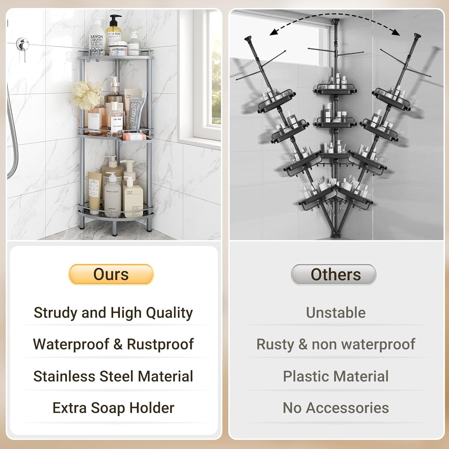 Quick and Easy Assembly: Forget the hassle of traditional mounted adhesive shower shelves! Our free standing corner shower shelf is designed for effortless assembly with no drilling or bonding required. Set it up in just minutes without causing any damage to your walls or ceilings