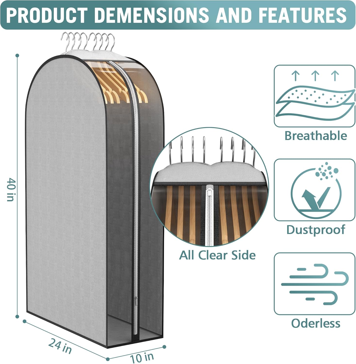 Side All Clear & Breathable Fabric: 1 side is made of transparent PEVA that helps you see what’s in each garment bag, you can easily find the clothes you look for. The rest are all made of breathable mesh fabric, odorless and durable, and visually cleaner