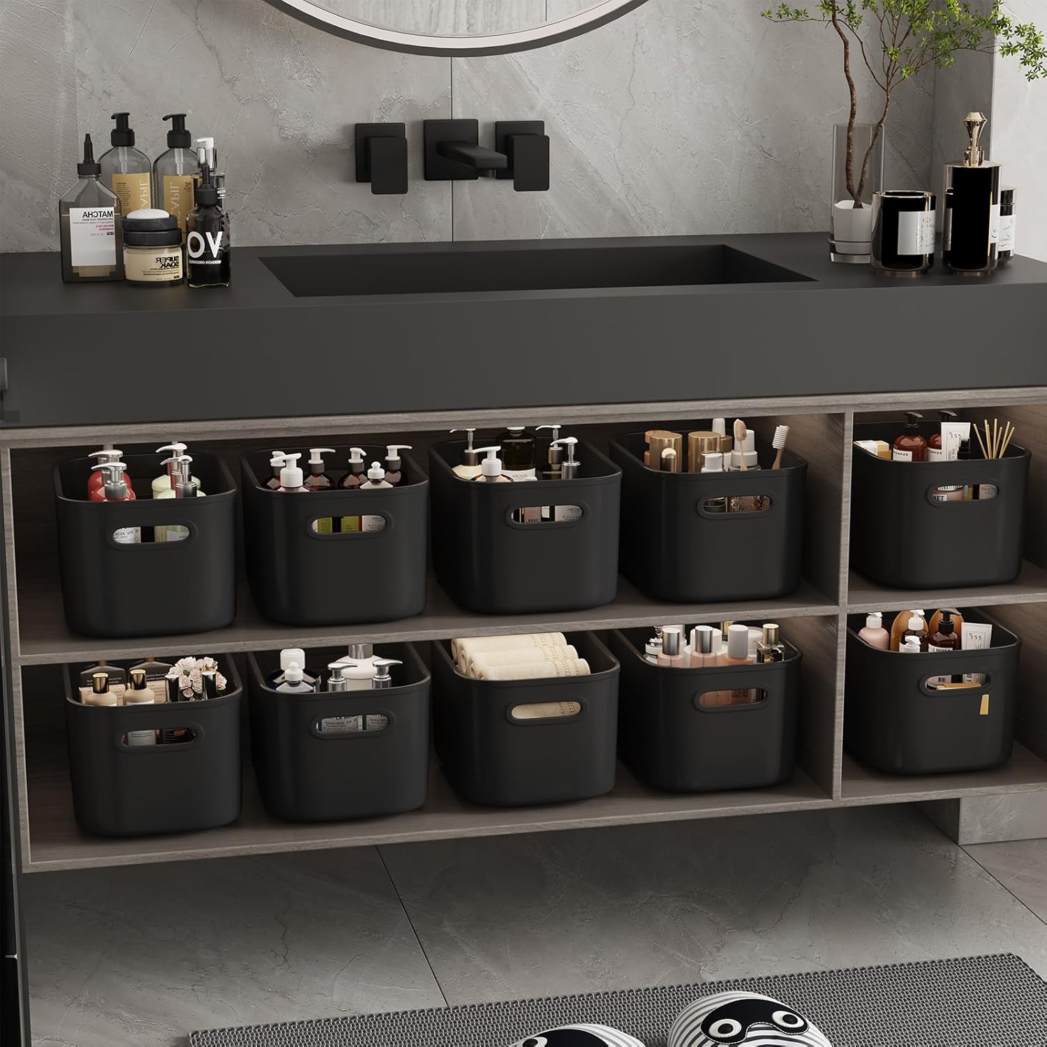 VERSATILE: This black storage bins work perfectly for organizing the pantry and cabinets, snacks, coffee, tea, books, cleaning supplies, arts and crafts, works great for bathroom, closet, camper, kitchen, under the sink, office garbage shelves,a greasy addition to your pantry cupboards