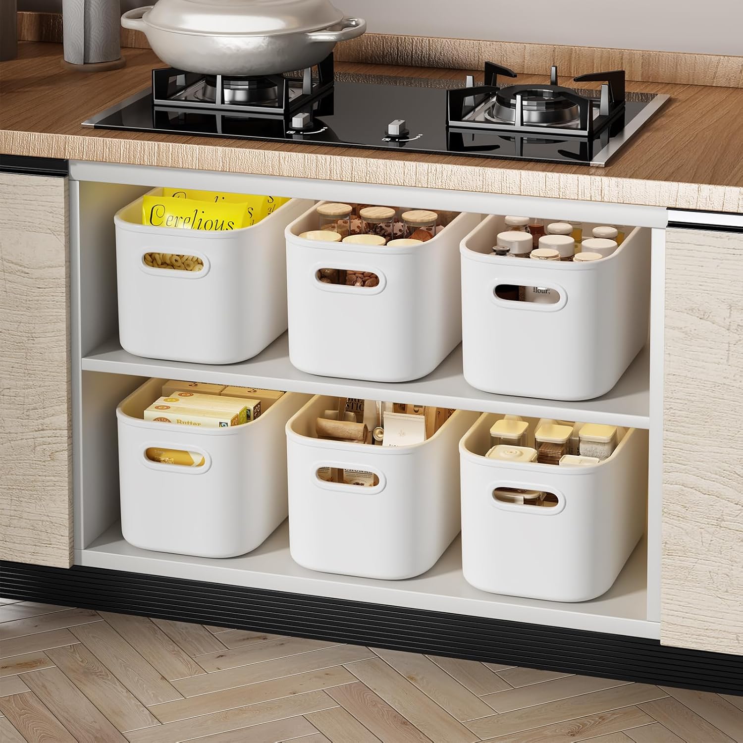 VERSATILE: The plastic organizer binswork perfectly for organizing the pantry and cabinets, snacks, coffee, tea, books, cleaning supplies, arts and crafts, works great for bathroom, closet, camper, kitchen, under the sink, office garbage shelves, a greasy addition to your pantry cupboards