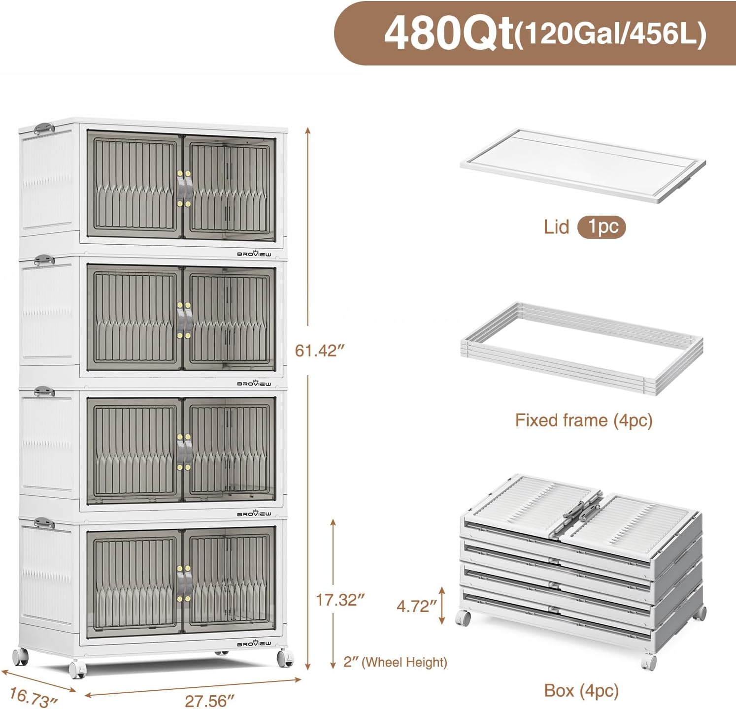 120 Qt Stackable Storage Bins with Lid, Closet Organizer and Storage Drawer, Collapsible Storage Box with Wheels, Plastic Clothes Storage Cabinet Containers for Home Organization, 4Pack White