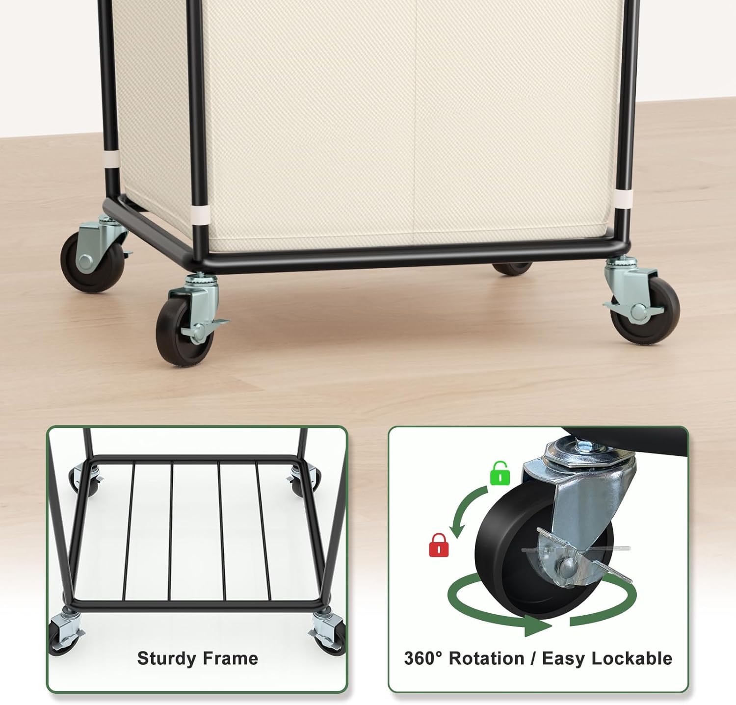 Large Laundry Basket with Wheels: with 360° rotating wheels, move it around with minimal effort, reducing the physical strain of carrying heavy laundry. This convenient feature makes the cart not only perfect for home use but also for dorms, laundromats, and other settings, turning every laundry session into a smooth, quick, and efficient task.