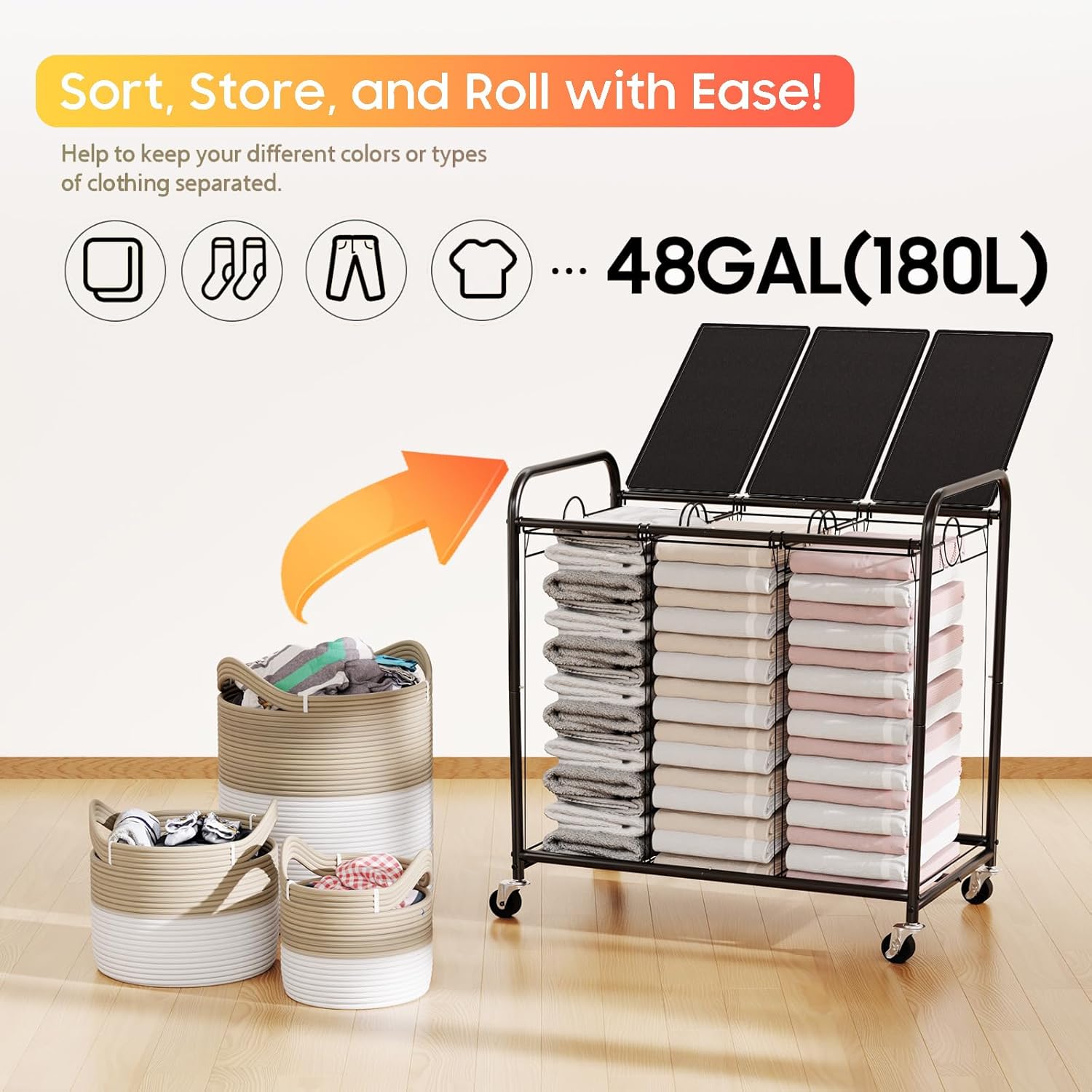 【Large Capacity】 The laundry sorter consists of 3 detachable 60L laundry compartments, with a total weight capacity of up to 90 lbs. The separate laundry bags effectively prevent clothes from getting tangled, mixed, or stained. It’s also perfect for organizing toys or other miscellaneous items, making it both practical and versatile.
