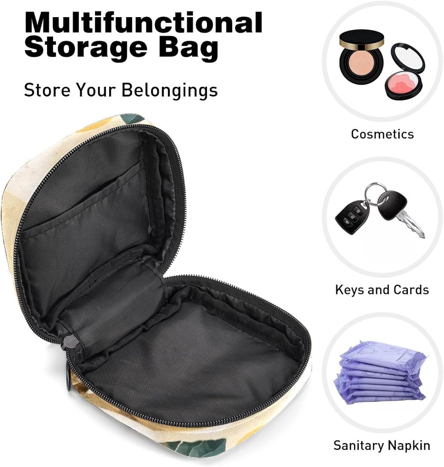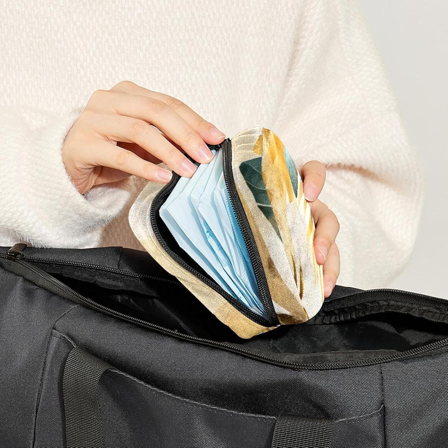 1Pc Period Bag for Women, Menstrual Pad Pouch for School Office, Reusable Sanitary Napkin Storage Bag Portable Feminine Period Kit Bag Abstract Golden Plants Tropical Leaves