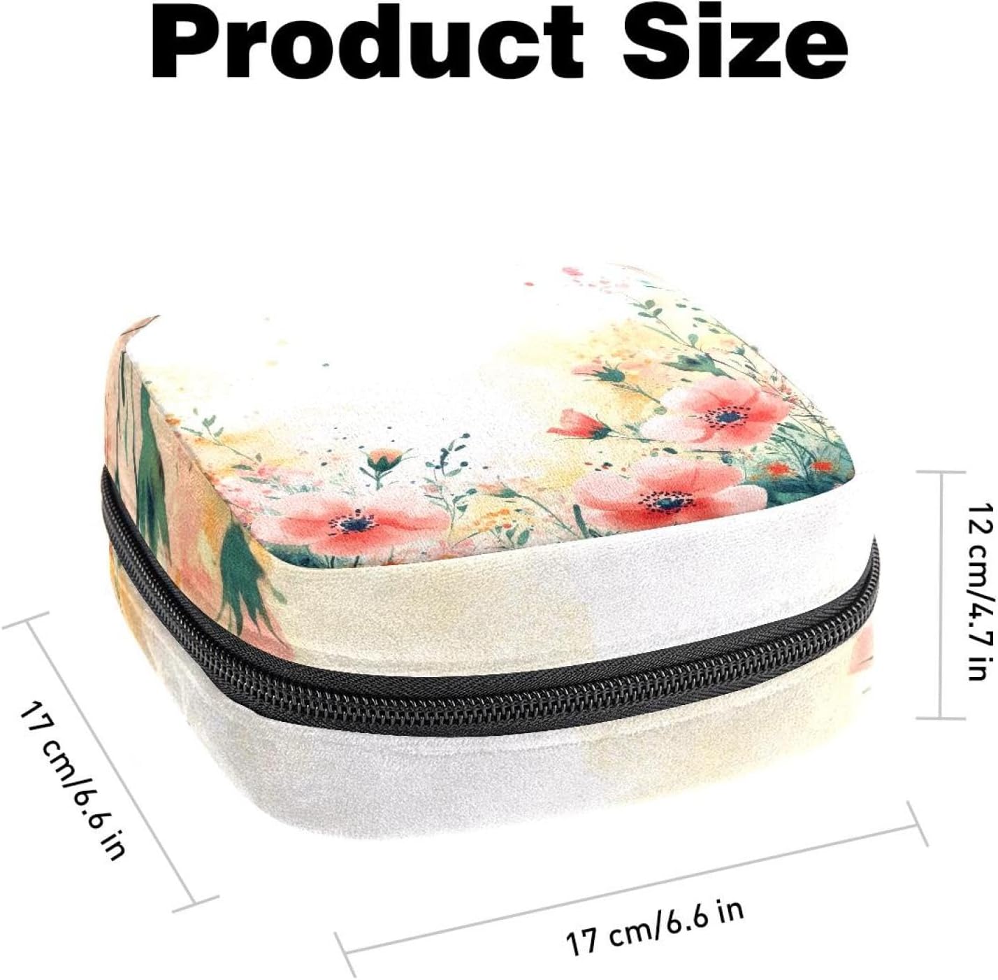 Size – 6.6*6.6*4.7 inch/17x17x12 cm, compact size and easy to carry, easily put in backpack or handbag when school, work, travel. The period bag can hold up to 10 pieces sanitary napkins, enough for one day’s replacement, a small compartments inside for small sanitary napkins.
