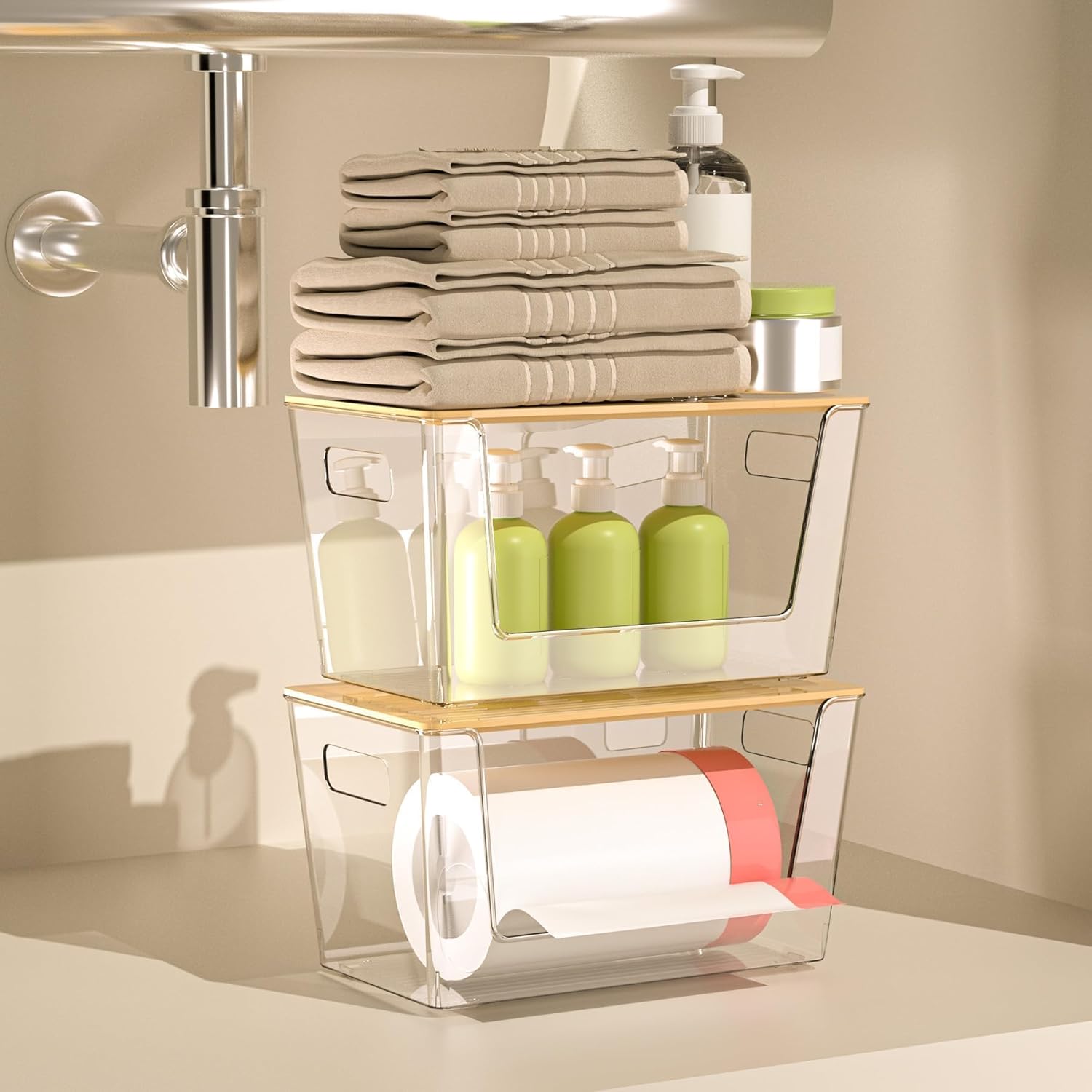 【Space-Saving Slim Profile】 10.6”x6”x6” size tucks under sinks, in narrow cabinets, or pantries. Stack two bins for multi-layer storage (e.g., bags on top, potatoes below).