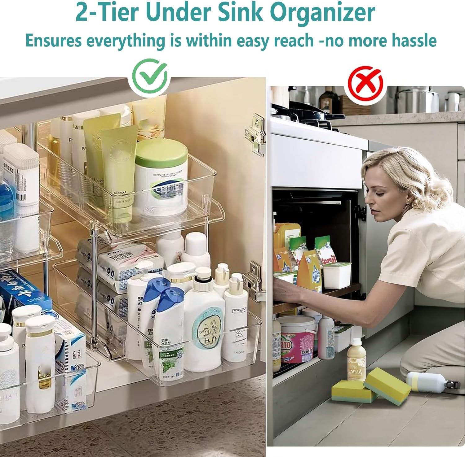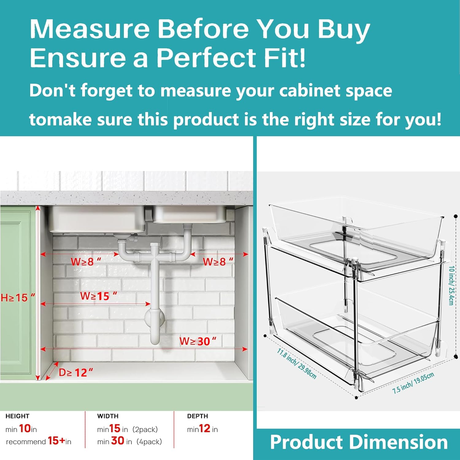 Multi-Purpose Pull-Out Organizer: Perfect for bathroom vanity, under-sink storage, kitchen cabinets, pantry shelves, or medicine cabinets. Store makeup, toiletries, cleaning supplies, spices, and snacks while keeping closet, drawer, and apartment decor clutter-free.Effortless Installation: No tools needed! Simply slide the stainless steel tubes into slots—even beginners can assemble this pull-out cabinet organizer securely. (Please note: be careful not to scratch your hands when inserting the stainless steel tube into the slot of the frame.)Stable Structure & Visibility : Bathroom organizer made of durable PET material and connected by four stainless steel support tubes. in addition, the bottom and top is fitted with 8 silicone non-slip pads for ensuring stability when pulling the organizer drawer out.Stacked in two layers, and the clear design allows you to easily find what you need. Saving time and keeping everything organizerSpace-Saving 2-Tier Pull-Out Cabinet Organizer: Maximize vertical space with two smooth-gliding drawers (11.8”L x 7.5”W x10”H). anti-sway tracks let you reach items tucked behind pipes under sinks or deep cabinets.