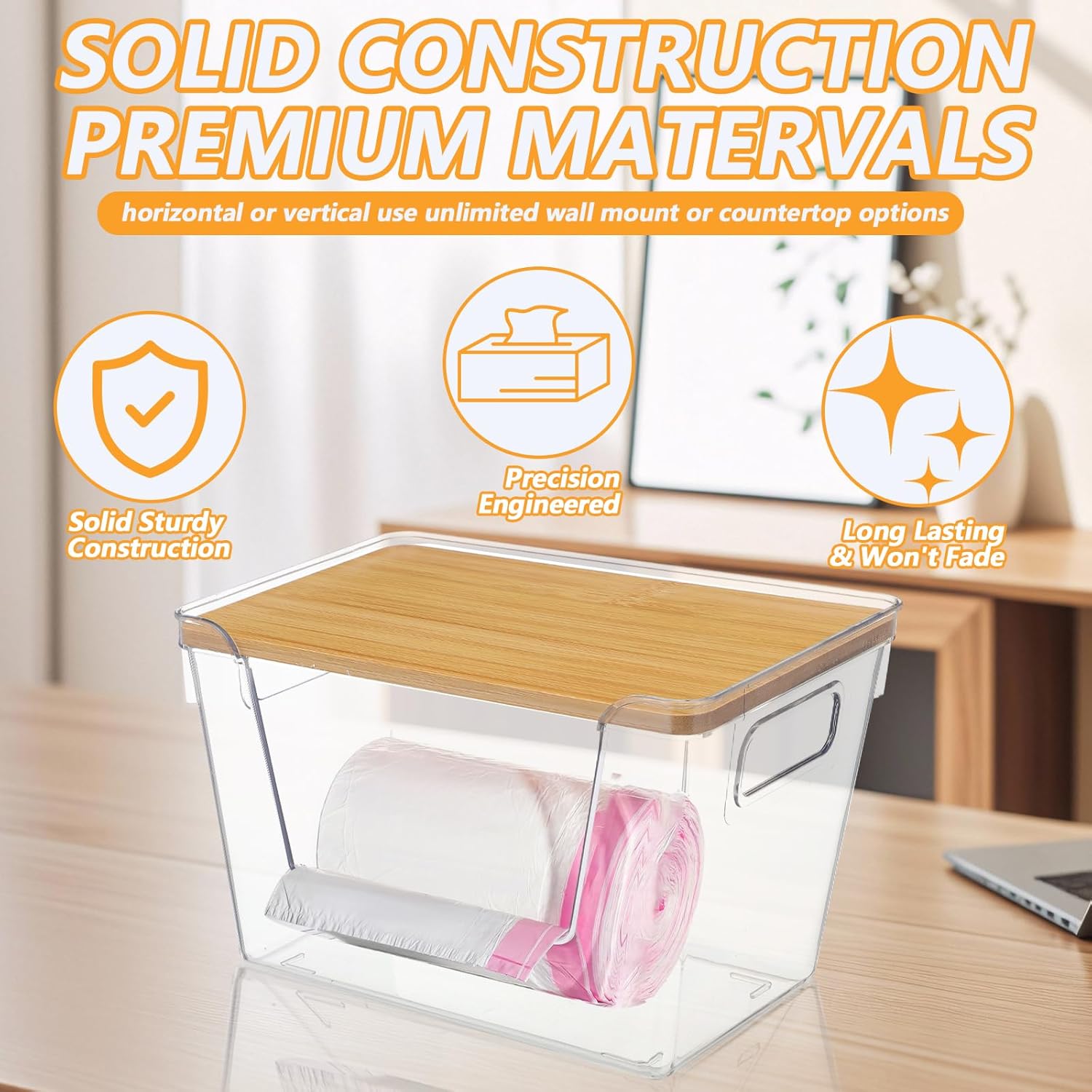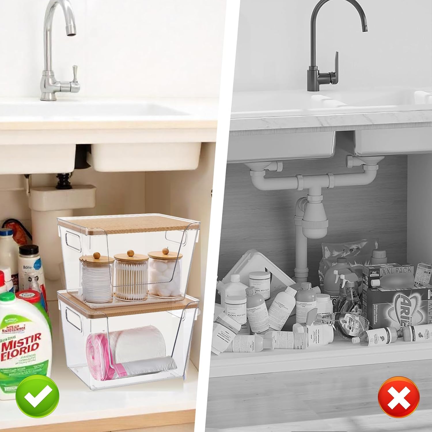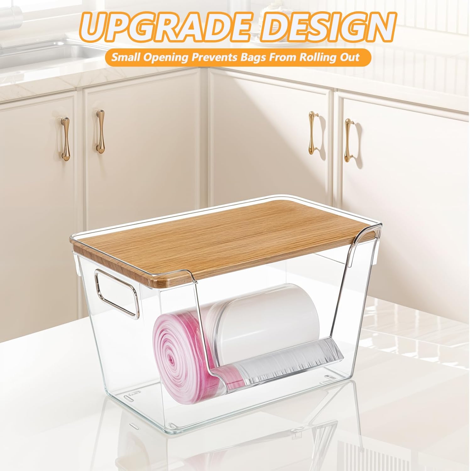 Stackable Structure: Our stackable trash bag organizer under sink optimizes vertical space. The lid enhances natural elegance and provides additional storage. Garbage bag holder dispenser is perfect for under the kitchen sink, it creates extra room for cleaning supplies.