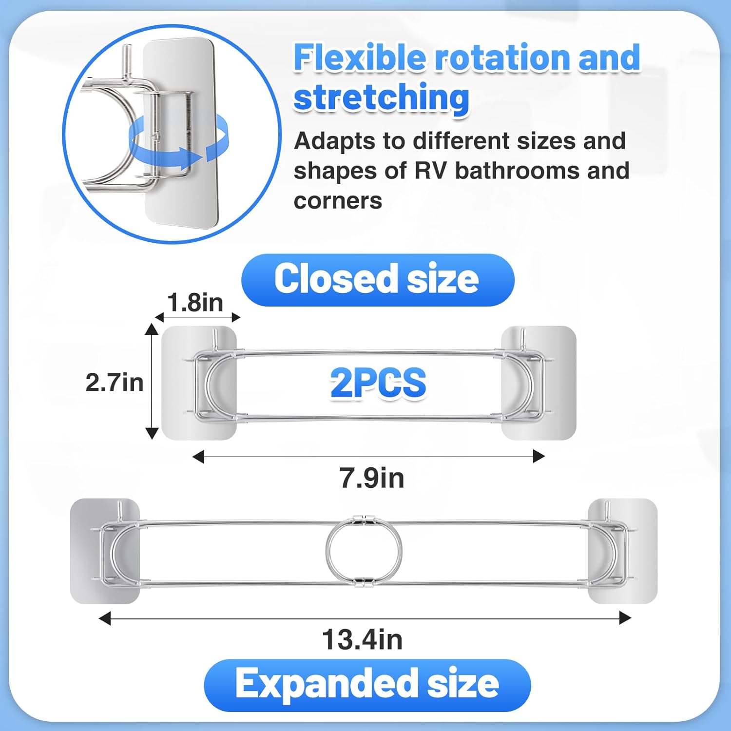 【Length Adjustable】The RV shower corner organization bar is adjustable from 7.9 inches to 13.4 inches in length, adaptable to fit different sizes of RV shower area corners. Also our product has been upgraded with small hooks on both sides of the bar for hanging bath sponges or other small items.