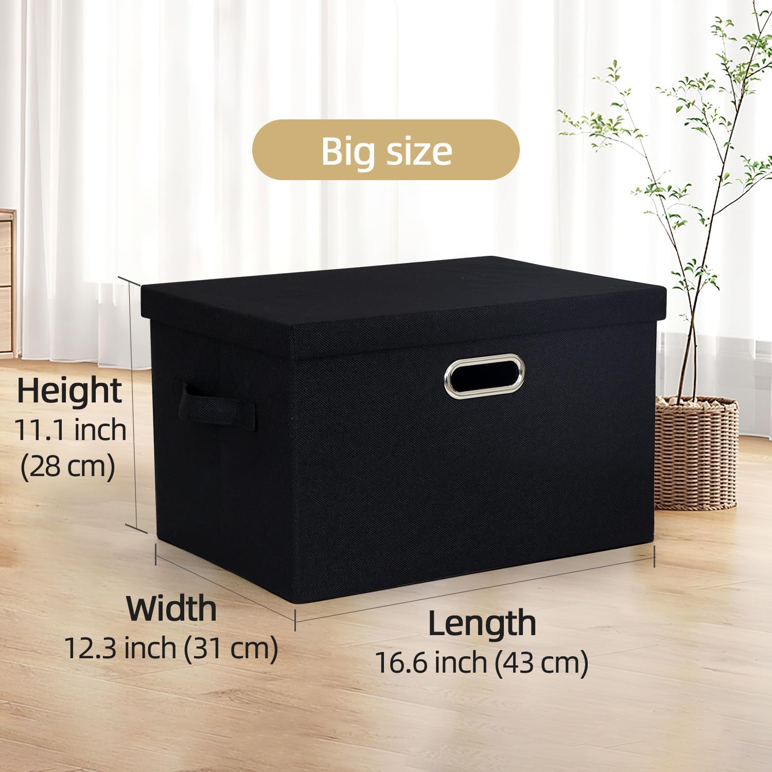 Two Size Options: The larger size measures 16.6 x 12.3 x 11.1 inches (L x W x H, 43 x 31 x 28 cm), while the smaller size measures 15 x 11 x 8.3 inches (L x W x H, 38 x 27 x 21 cm). Each set includes 2 boxes with lids.