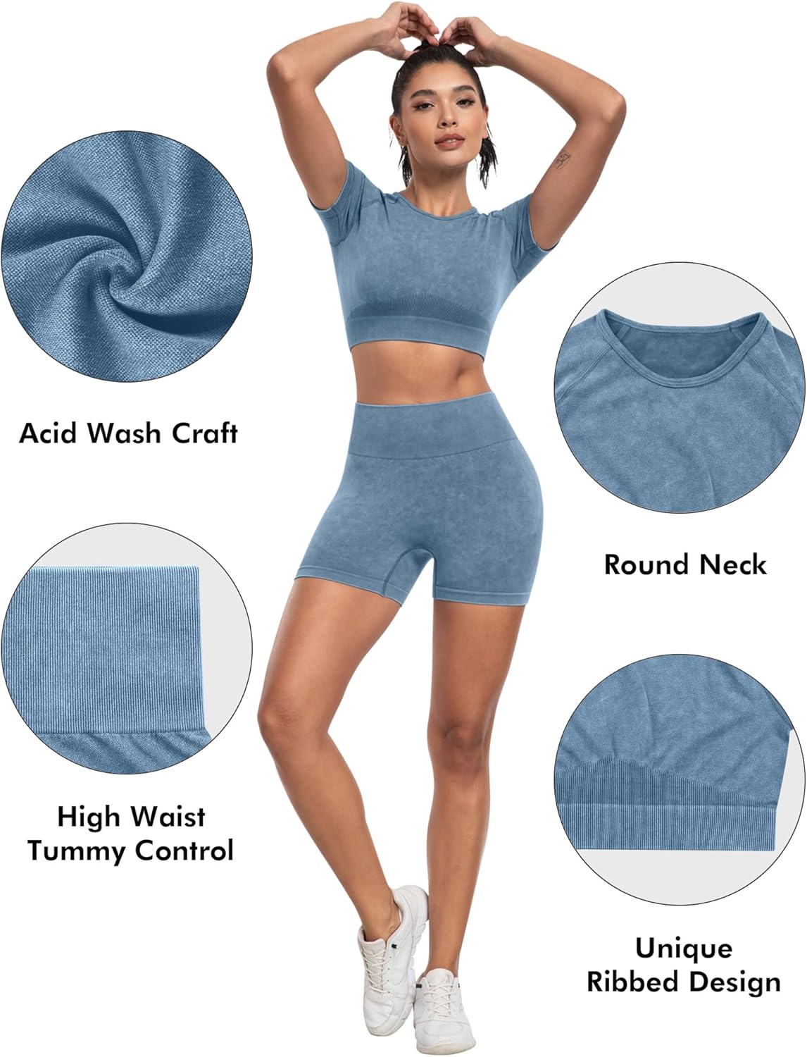 2 Piece Workou Short Sleevet Sets for Women,Seamless Summer Gym Tops High Waist Yoga Shorts Outfits