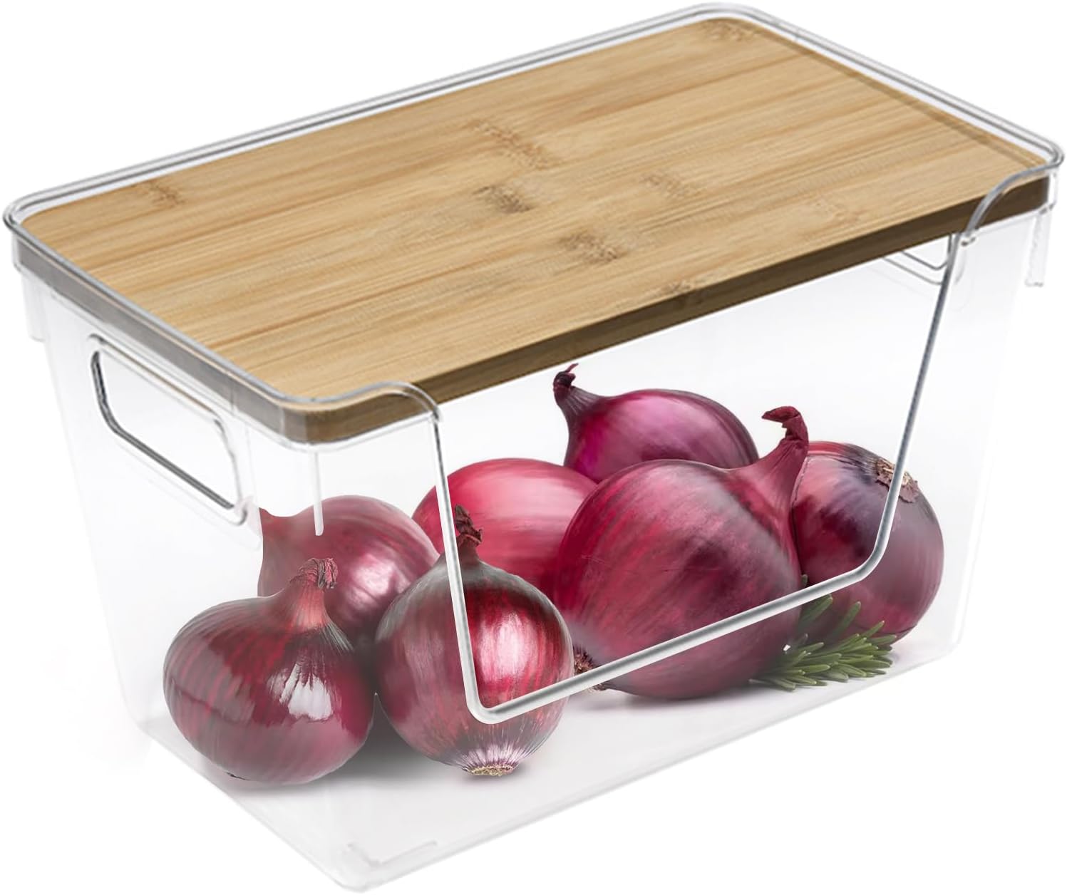 Safe BPB-Free Material: Our onion storage containers are made of high-quality PET transparent material, and the top is made of 100% natural bamboo, which looks similar to wood, with smooth edges and no burrs, which will not cause damage to food and is a protector of food.There are handles on both sides for easy carrying