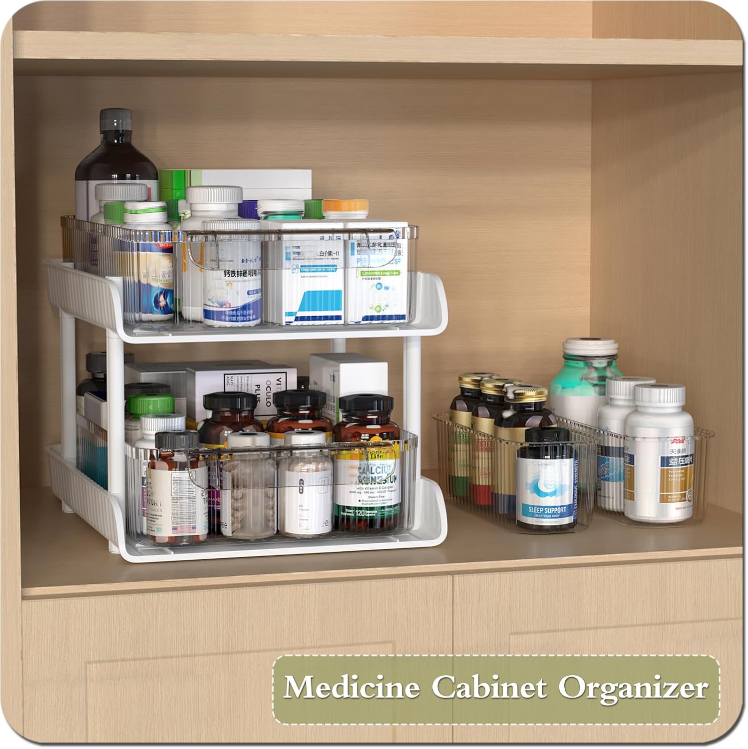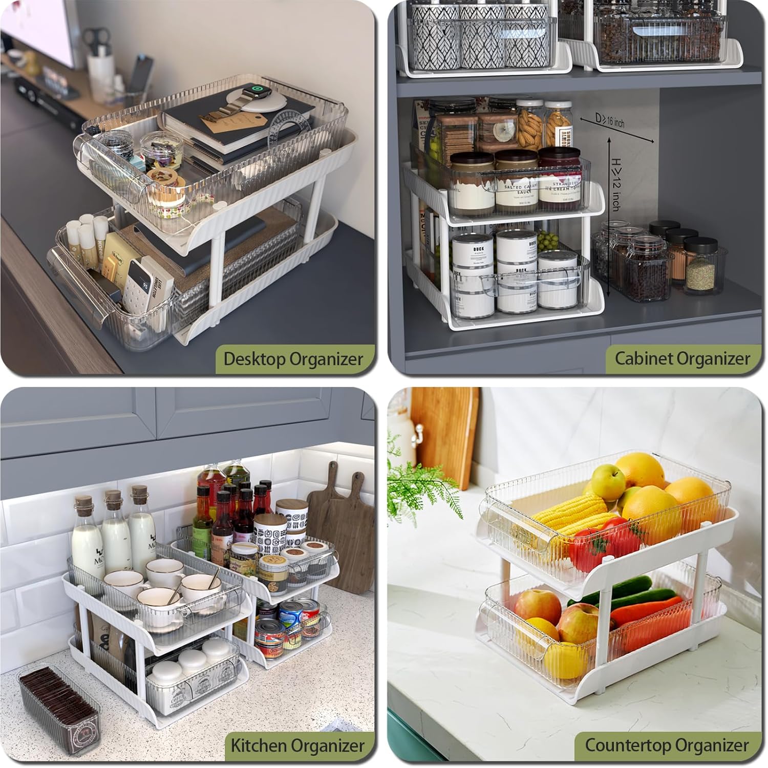 【Multi-Purpose Organizer】This 2-tier slide-out drawer organizers have a wide range of uses, and can help better organize the space in places such as the bathroom, kitchen, closet, under sink, pantry and shelf. They can be used as organizers for medicine, snacks, food, beverages, spices, toiletries and skincare products.