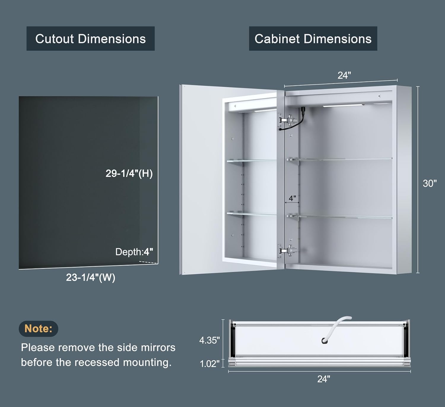 Be the first to review “24×30 Inch Lighted Medicine Cabinet with Mirror, AL Alloy Frame, Plug-in or Hardwired, Recessed or Surface Mount, 3 Colors/Dimmable/Interior Sensor Light/Defog, 2 Outlets & USBs, 2 Shelves”
