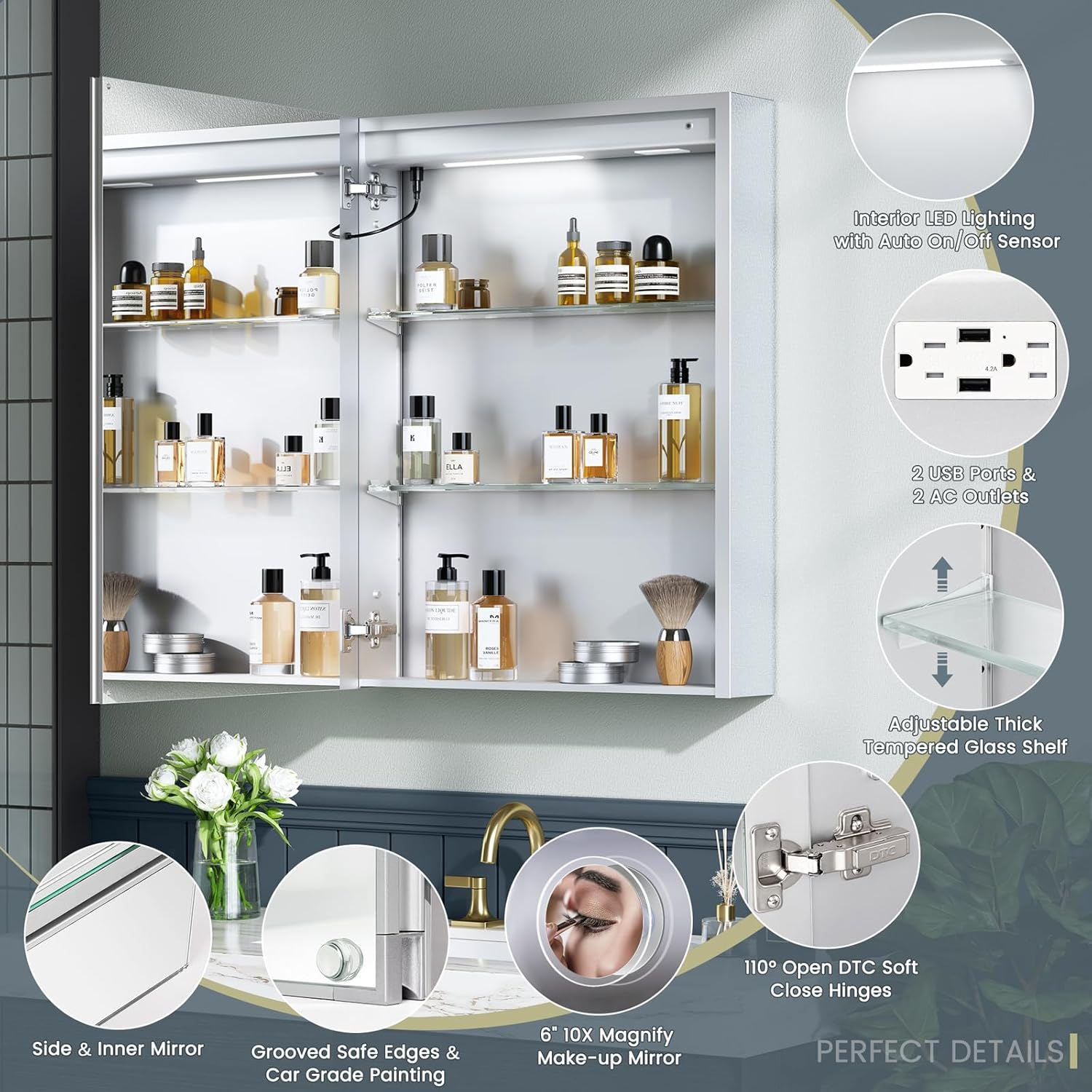 24×30 Inch Lighted Medicine Cabinet with Mirror, AL Alloy Frame, Plug-in or Hardwired, Recessed or Surface Mount, 3 Colors/Dimmable/Interior Sensor Light/Defog, 2 Outlets & USBs, 2 Shelves