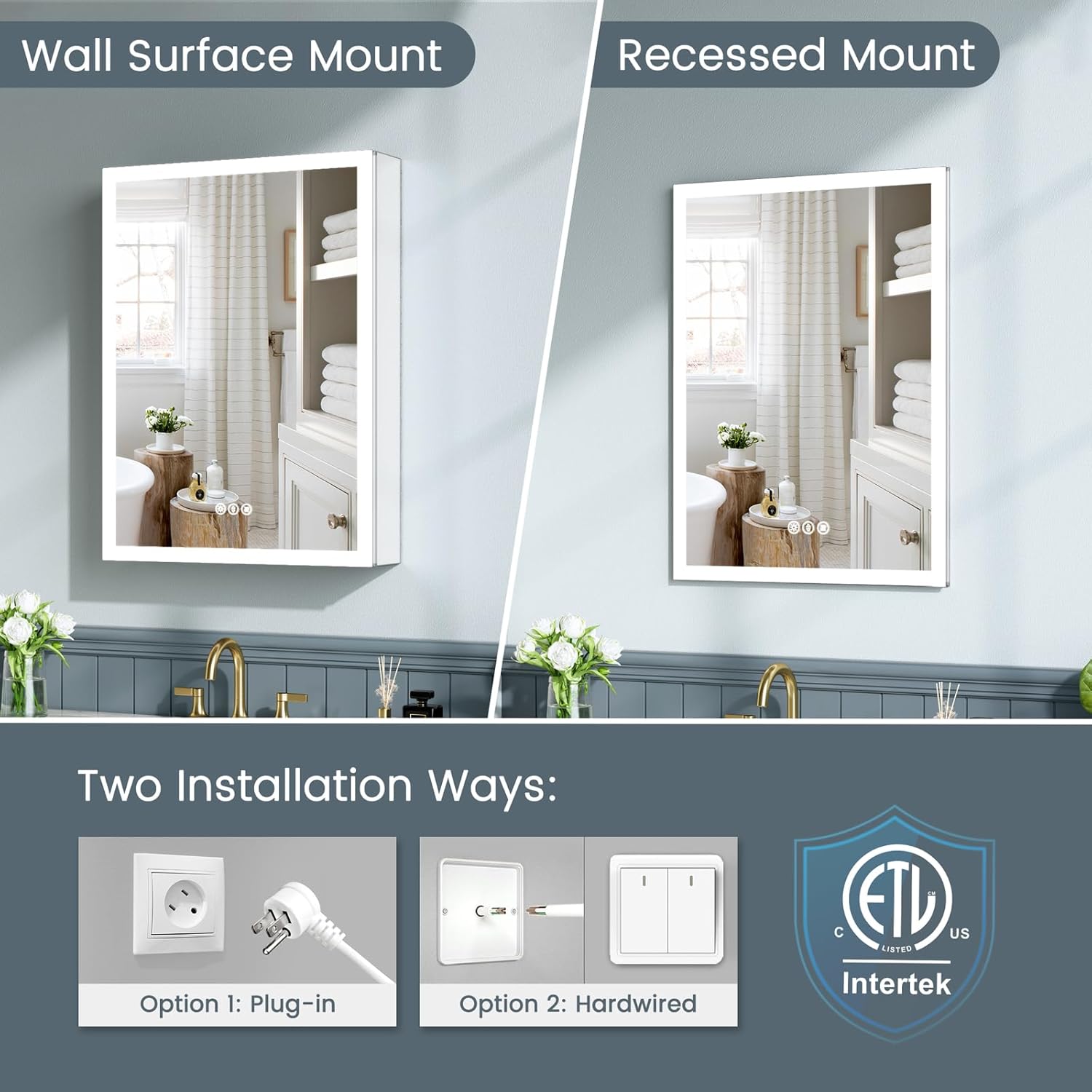 Versatile Installation Options: Plug-in or Hardwired, Recessed or Wall Surface Mount – You can choose between plug-in or hardwired options, with a real ground wire included for enhanced safety. The provided junction box simplifies the hardwired setup. Additionally, our medicine cabinet is thoughtfully designed for both recessed and wall surface mounting. It arrives fully assembled, seamlessly blending with various decor styles and spatial requirements