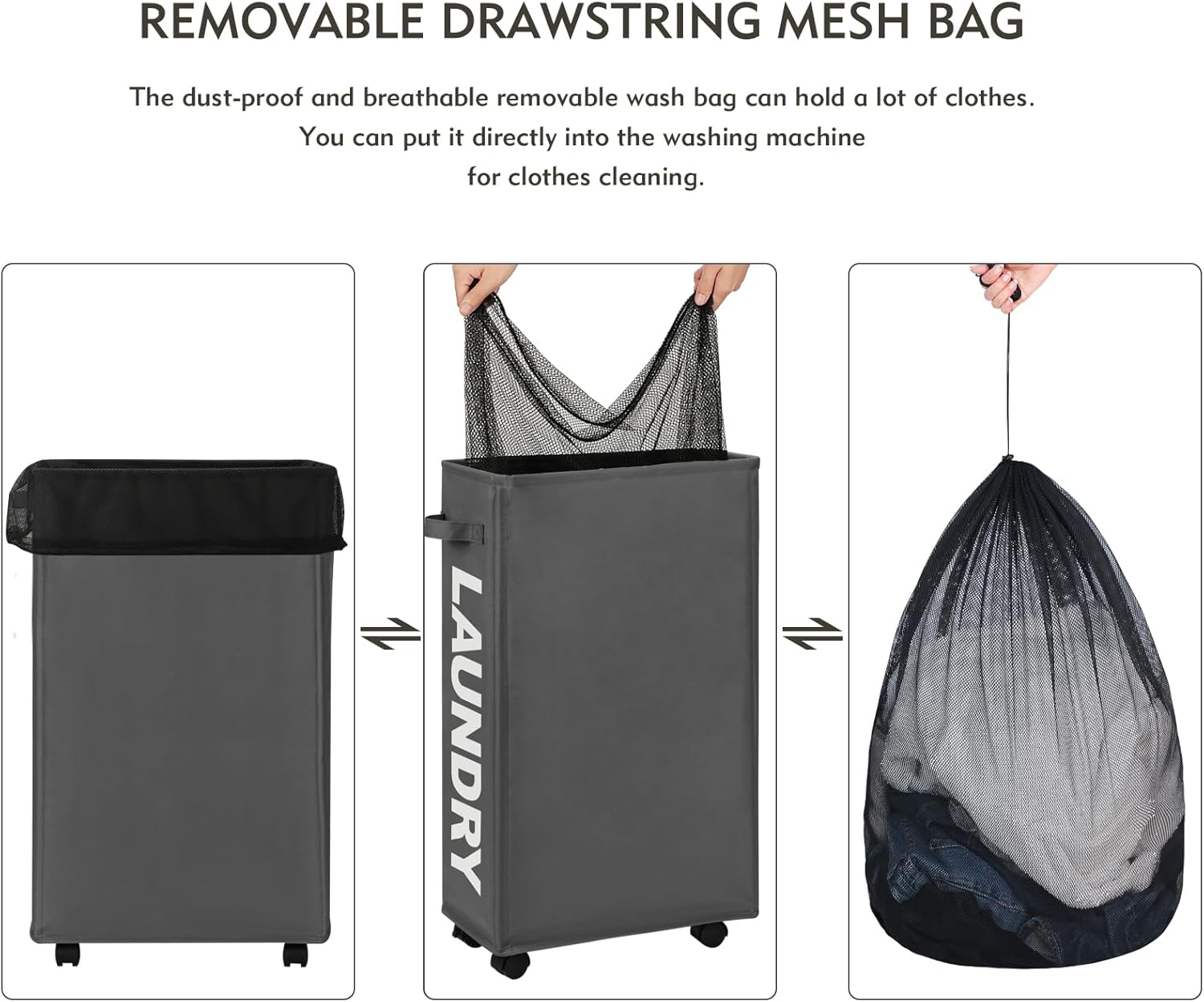 29″ Slim Rolling Laundry basket with Removable Bag on Wheels, 70L Collapsible Narrow Corner Laundry Hamper, Foldable Storage Bins, Grey