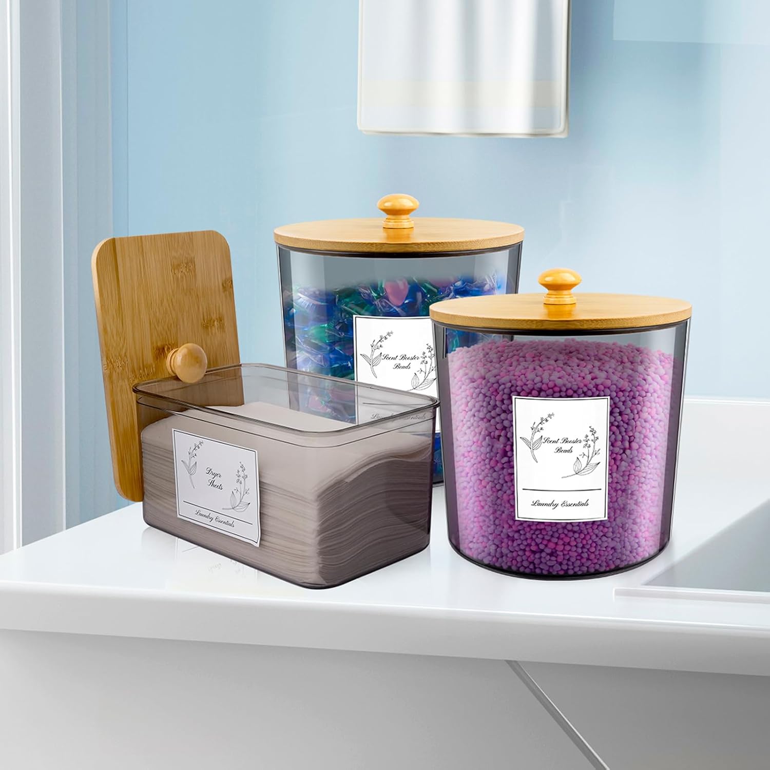 Laundry Pods Container Set: This laundry containers for organizing set includes 2 laundry containers for detergent (top diameter 6.5″, bottom diameter 5.6″, and height 6.3″), 1 dryer sheet holder (7.1″L x 4.7″W x 3.5″H), 2 clear spoons, and 16 pre-made waterproof labels.