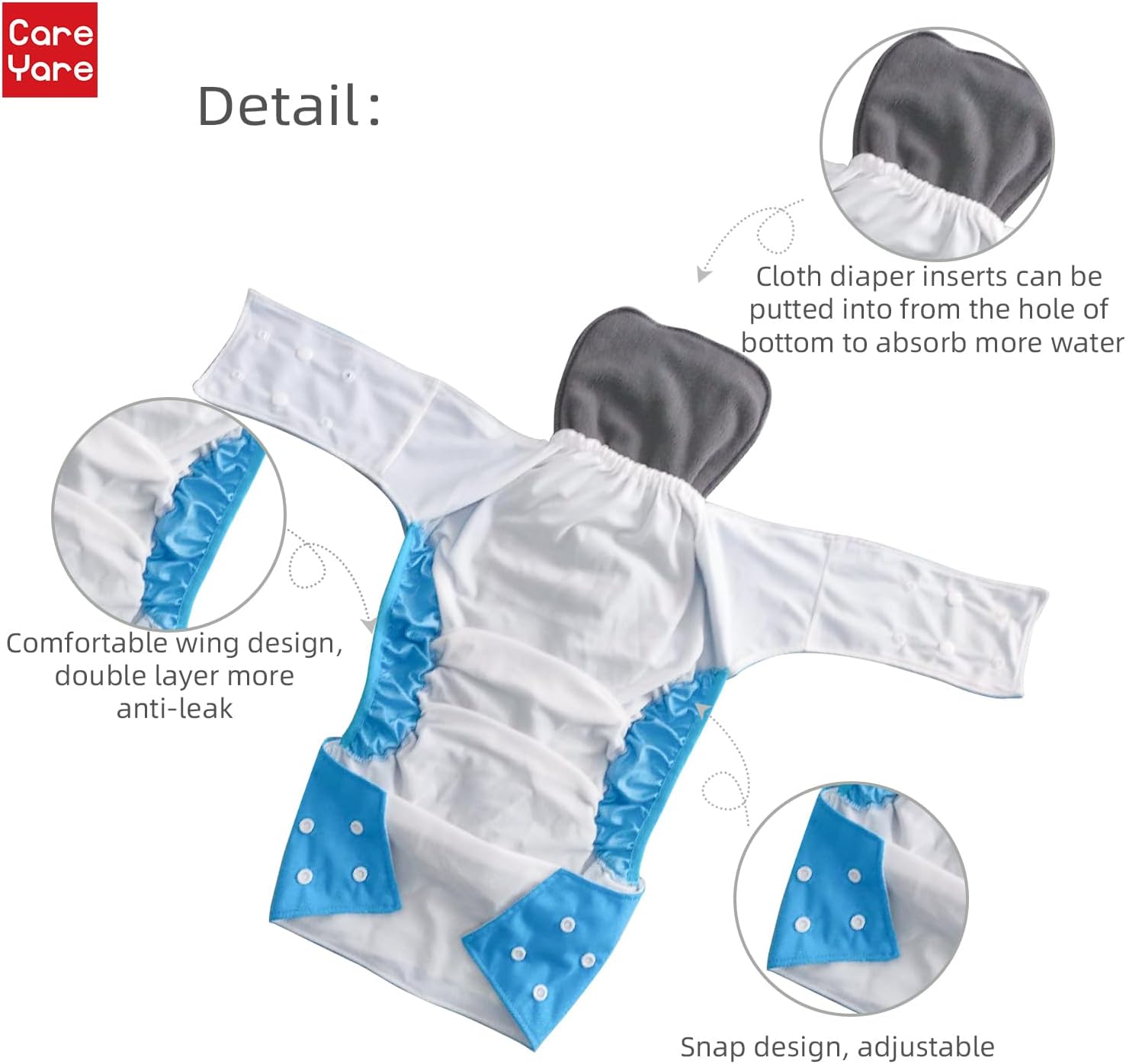Snap design, adjustableComfortable wing design, double layer more anti-leakCloth diaper inserts can be putted into from the hole of bottom to absorb more water