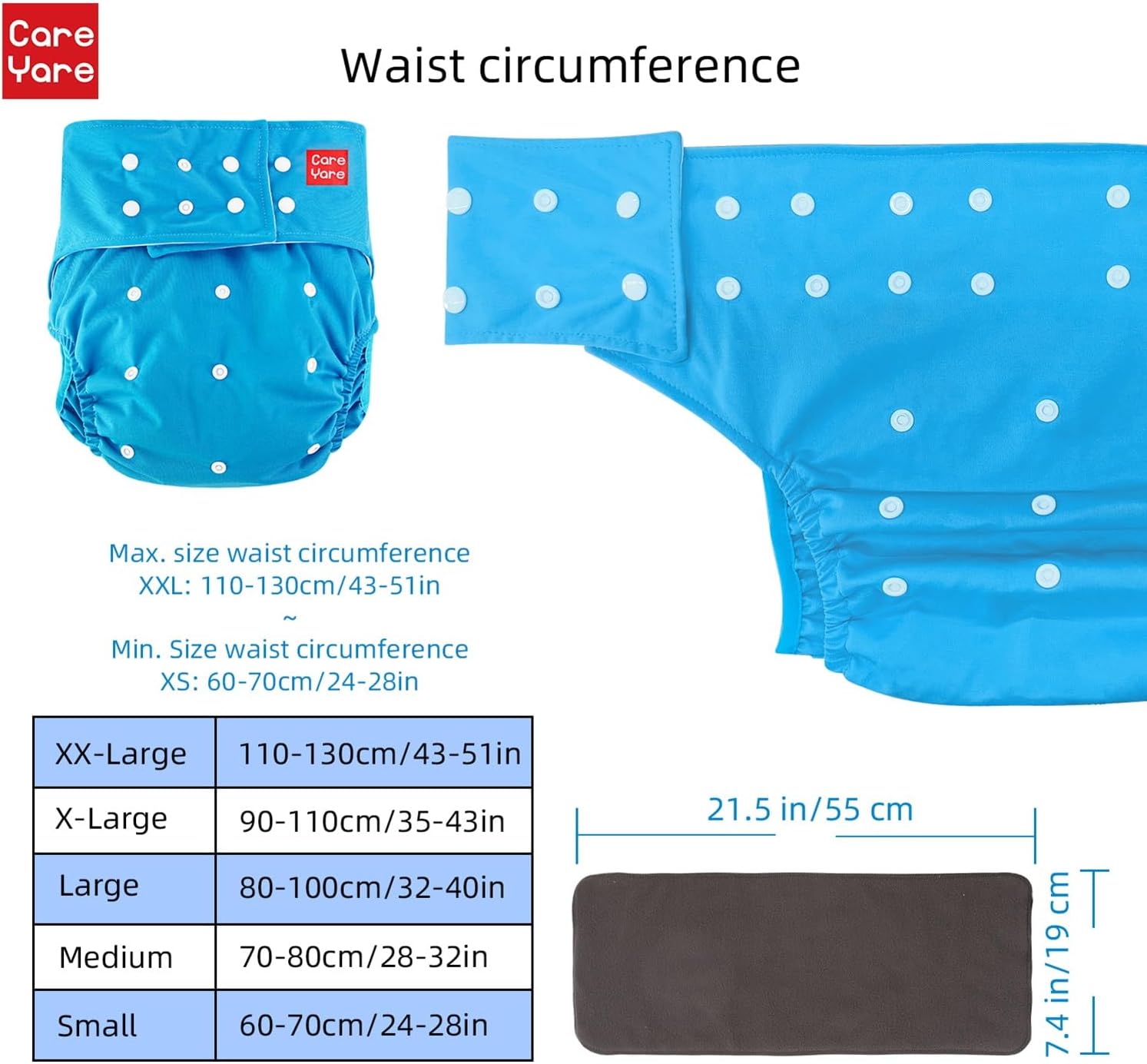 [Adjustable] At Care Yare, We Understand That Incontinence Can Be A Challenging And Sensitive Issue. Similarly, We Know And Understand The Embarrassment Of Incontinence. That’s Why We Offer A Range Of Men’s Incontinence Underwear That Are Not Only Comfortable And Effective, But Also Discreet And Easy To Use. Incontinence Underwear For Men Size Can Be Adjusted Freely To Suit Your Size. Waist Circumference: XS(21in-23in) to XXL(43in-50in).4 Pairs Blue Adult Diapers With 4 Pairs Diaper Inserts