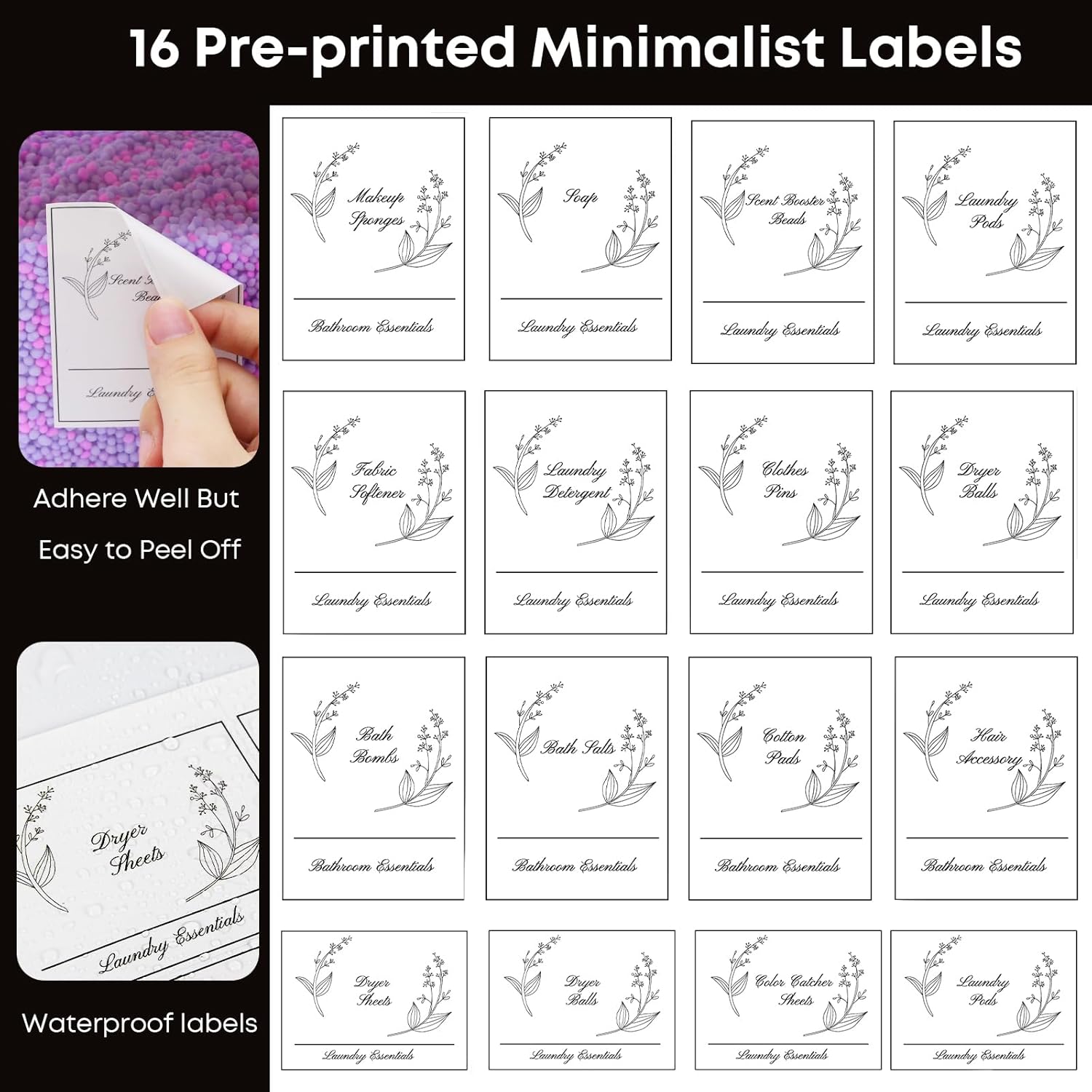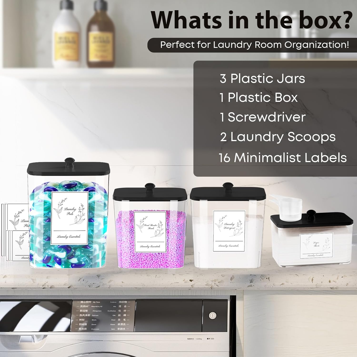 Package Includes: The laundry jar set includes 3 powder laundry detergent containers with lids, 1 laundry dryer sheet organizer, 2 clear spoons, 16 pre-made waterproof labels and 1 screwdriver. Elevate your laundry room organization and storage with our stylish and multifunctional laundry detergent dispenser