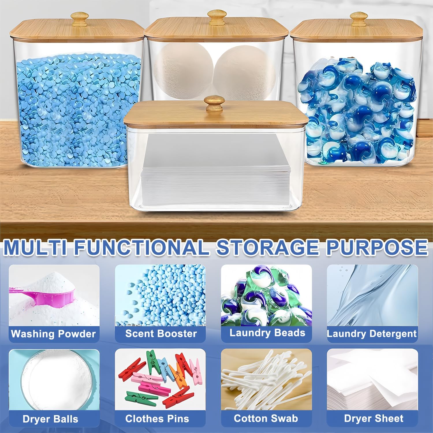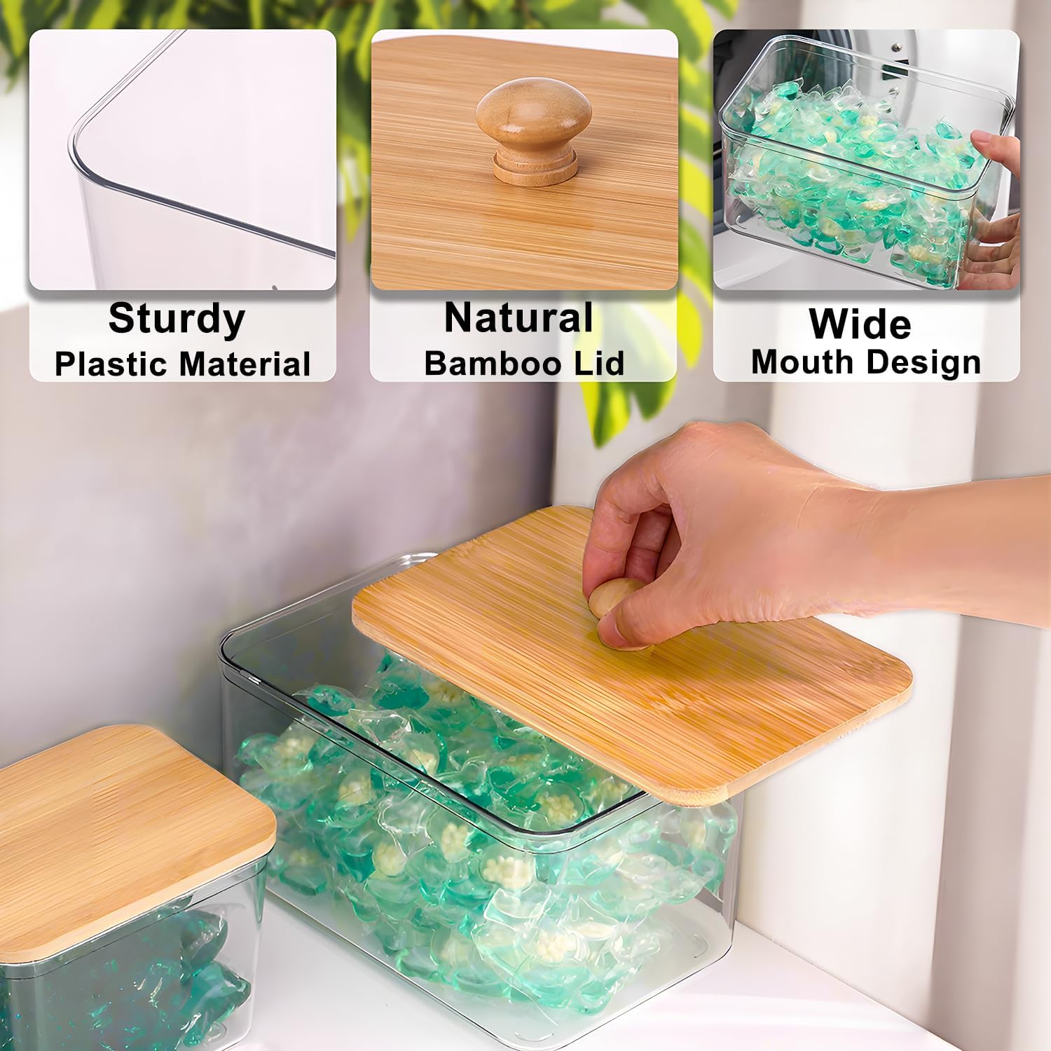 【Laundry Storage Organizer Set】This laundry pods container set includes – 3 x large containers, 1 x dryer sheet holder, 3 x scoop. Ideal for organizing laundry pods, scent boosters, and other essentials in your laundry room, kitchen, or bathroom. The durable containers are dishwasher-safe, and the bamboo lids can be easily cleaned with a damp cloth for long-lasting use.