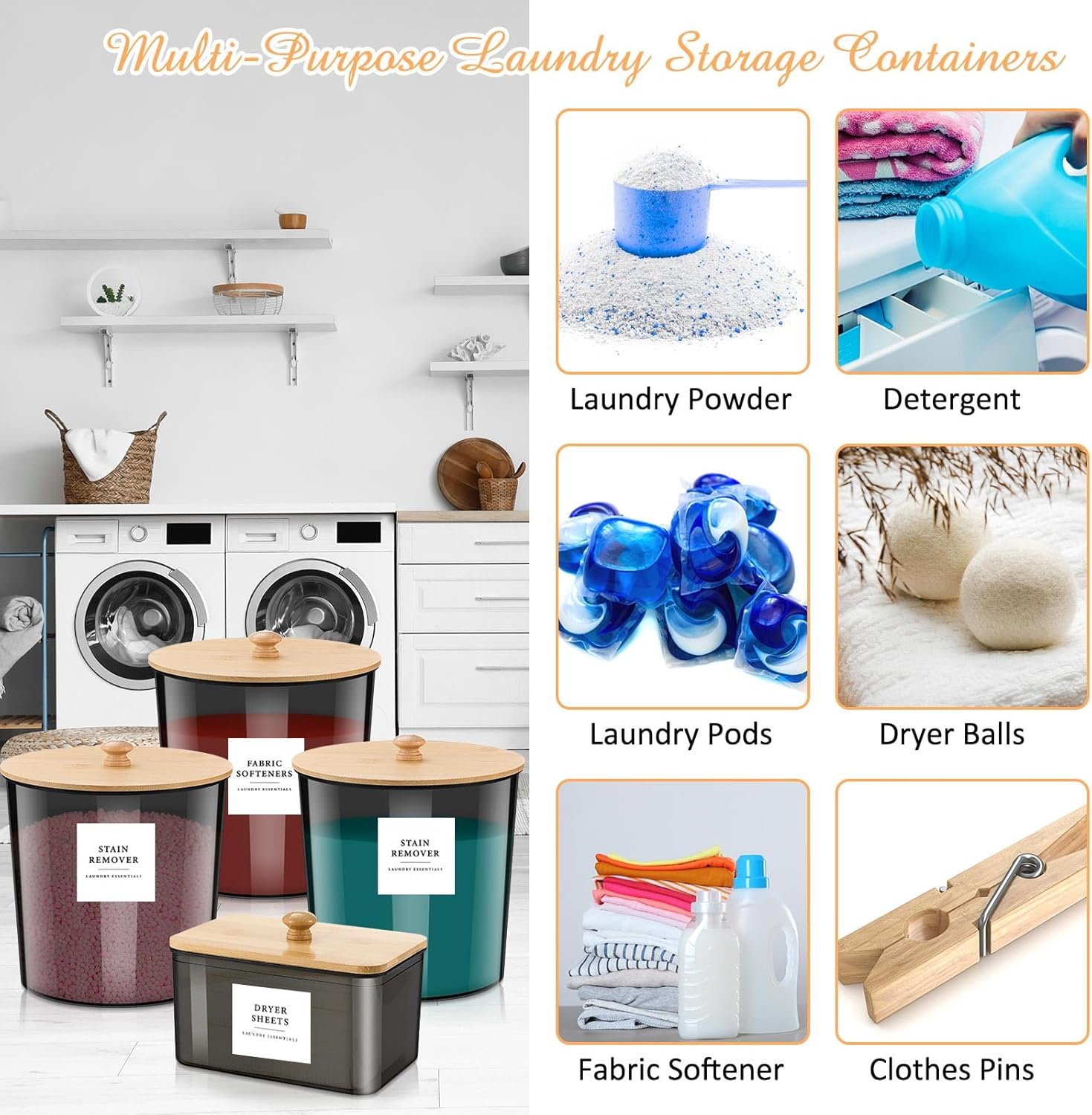 Quality Material: our laundry room organization is made from PET, it can serve you for a long time; The container is adorned with a bamboo lid that adds a touch of sophistication to this useful accessory