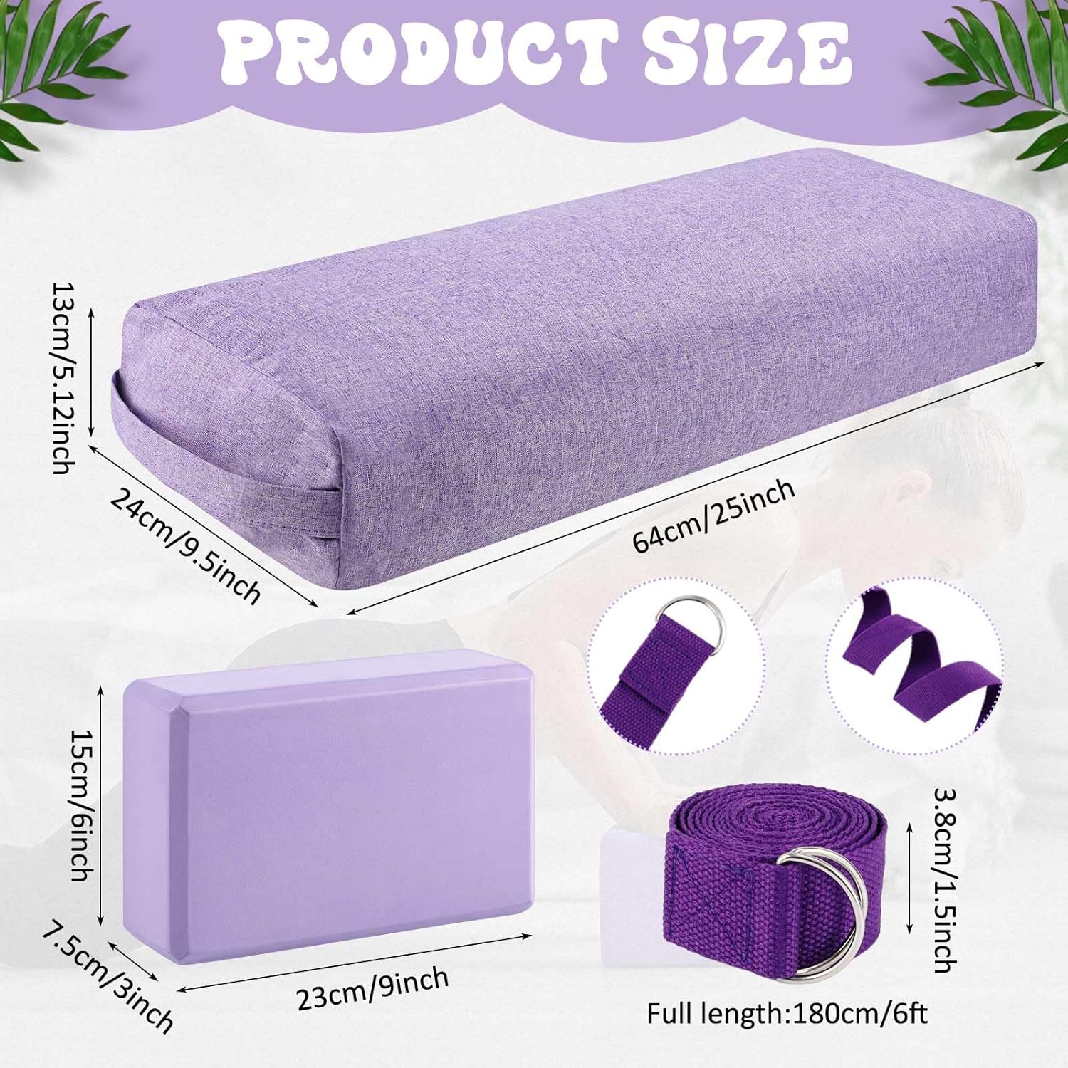 Complete and Multi Purpose Yoga Set: this set includes 1 sponge yoga bolster (64x24x13cm), 2 yoga blocks (23x15x7.5cm), and 1 yoga stretching strap (3.8cm wide, 1.8m long), a convenient all in one solution that allows you to perform various yoga poses and deepens your stretches for enhanced fitness levels