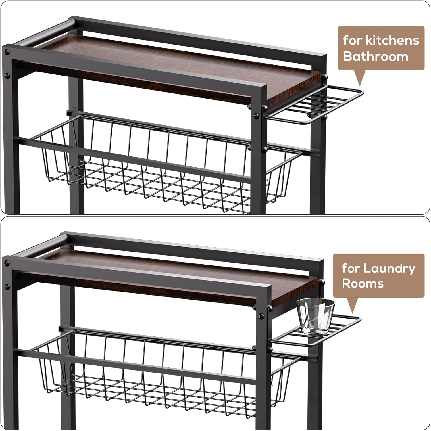 Sturdy and Durable: The slim laundry rolling cart is made of a sturdy metal frame and thickened wooden boards. The heightened mesh basket prevents items from falling. Please note that the lower layer should bear more weight than the upper layer to ensure stability
