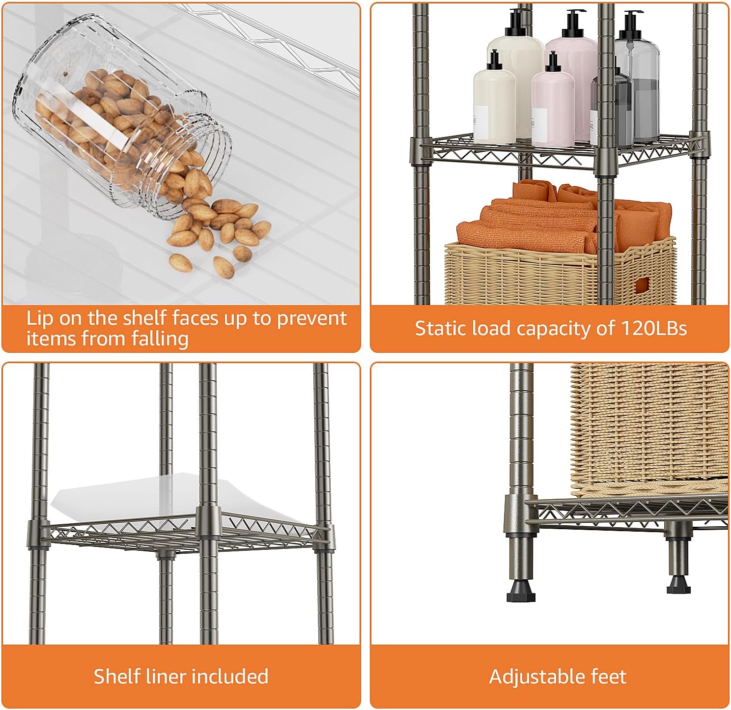 SUPERIOR MATERIALS: Our storage rack is made of carbon steel, which greatly improves its load-bearing capacity, and ensures its stability and durability. It also comes with a few plastic shelf liners, which can prevent small items from falling.