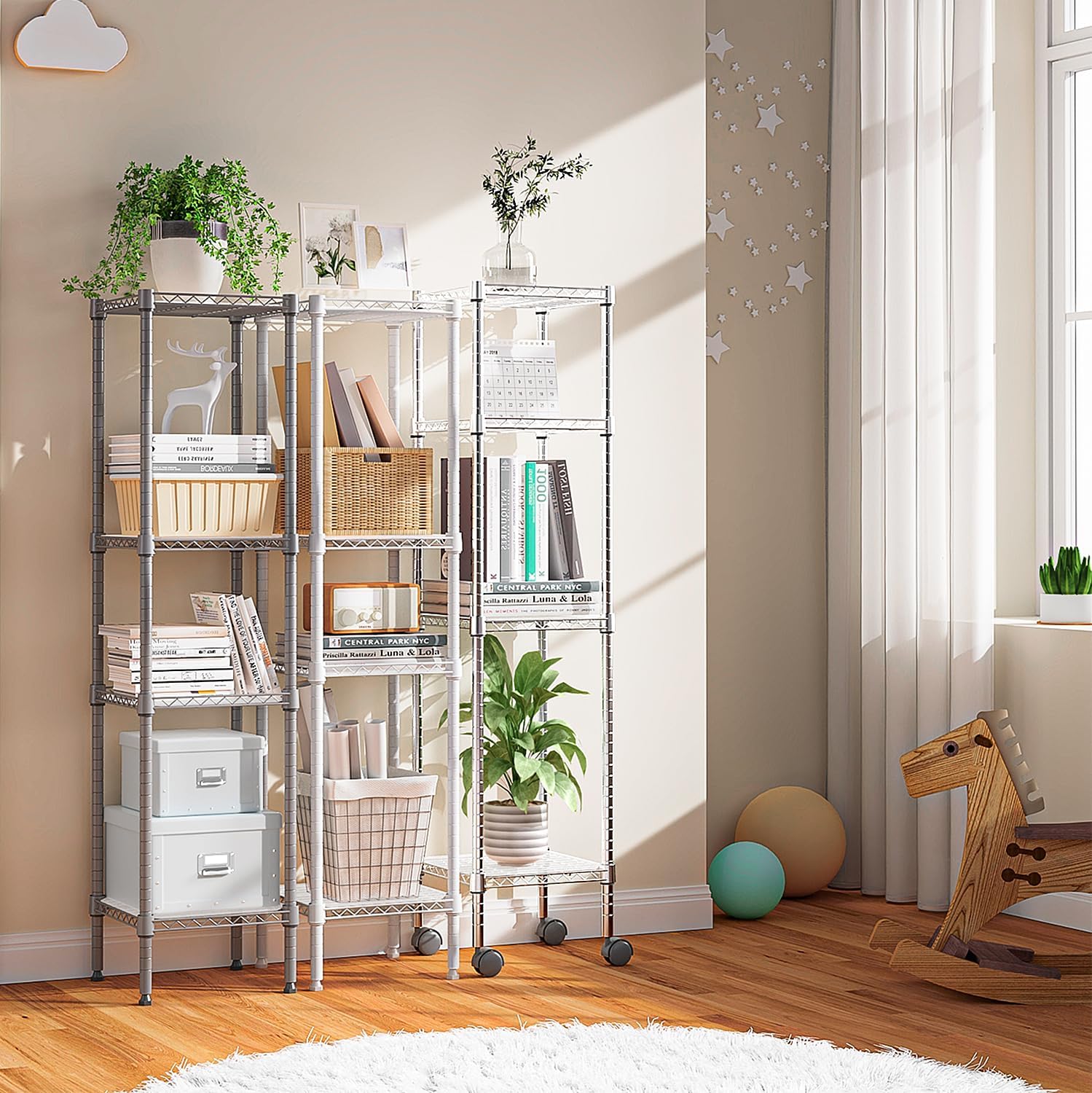 IMPACT & SPACE SAVING: With its delicate design, this storage shelving is designed for small spaces. Meanwhile, it has multiple metal shelves, which can create more vertical storage space, perfect for narrow spaces or corners.