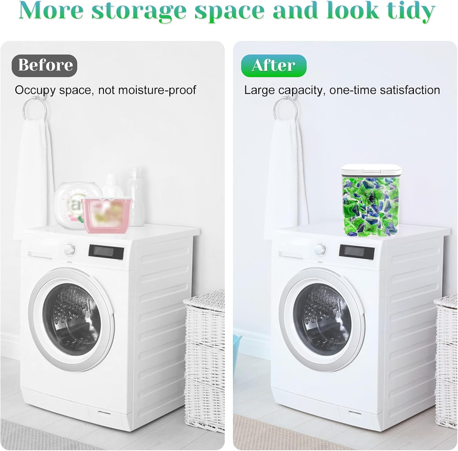 Keep Your Laundry Room Organized: Our large-capacity laundry pods container is an essential organizer for any laundry room, laundry detergent dispenserproviding an efficient and hassle-free laundry routine. It comes with a measuring cup for easy access to laundry pods or powder detergent.