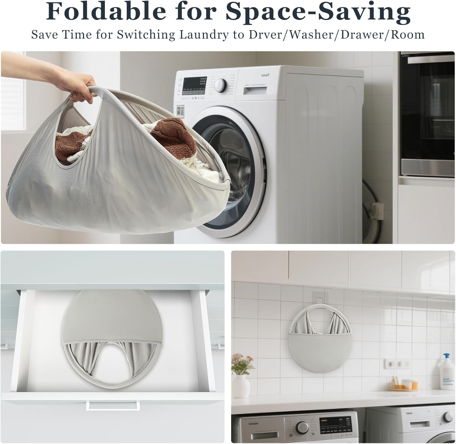 Foldable Laundry Basket: Pop up laundry hamper helps you remove clothes from dryer/washer Easily. Put the expanded laundry basket into the washing machine or dryer, Rotate the drum to gather all clothes at once without losing or dropping any of your clean clothes.