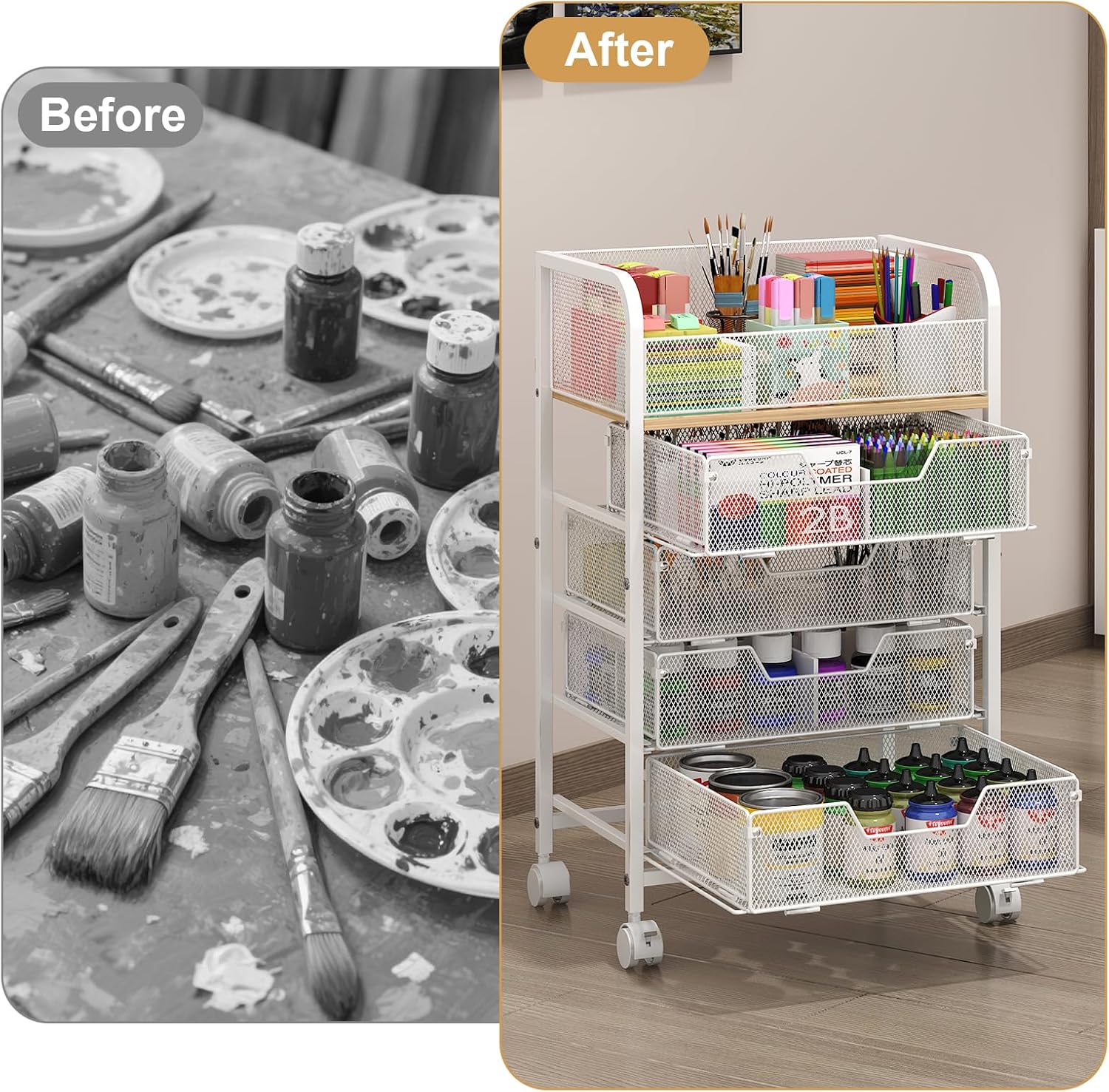 【Materials lightweight and safe】: Craft storage cart is designed with iron and wood combination, mesh drawers, stronger than plastic, stronger load-bearing. The top is designed with rounded corners to prevent bruises, smooth and safe. There is a fence around to prevent items from falling when moving and ensure the safety of items.