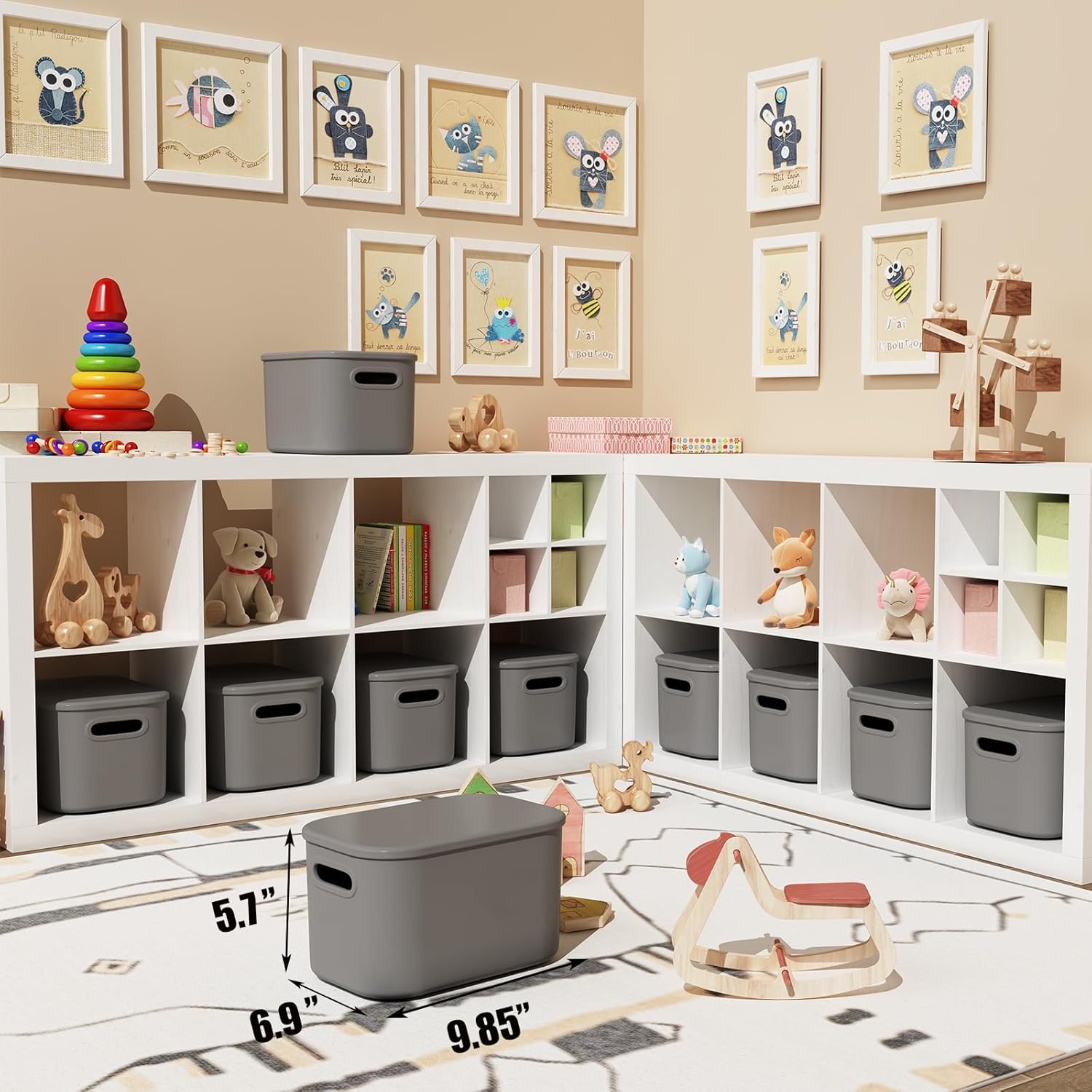 The gray storage bins with lids are perfect for organizing pantry, shelves, cabinet in kitchen, laundry room, bathroom, closet, classroom, a desk, it’s easy to grab when you want to store Lego toy and play with them.Perfect Capacity: 9.85″L x 6.9″W x 5.7″HColor: Gray/GreyQuantity: 8 Pcs/6Pcs AvailableNOTE: PLS CHECK THE MEASUREMENT BEFORE YOU PURCHASE.