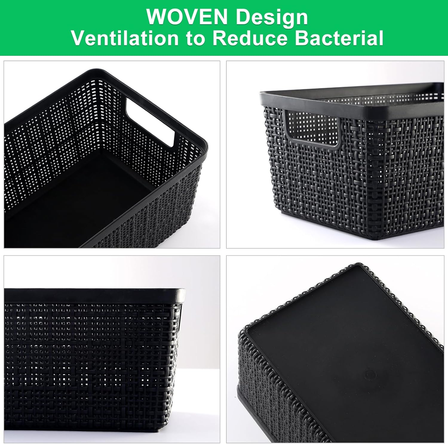 PACKAGE DETAILS: 6 plastic baskets with woven patterns and lids, size: 10.7 L x 7.1 W x 4.8 H inches, the baskets are designed with small holes to help ventilation, better organize and store items