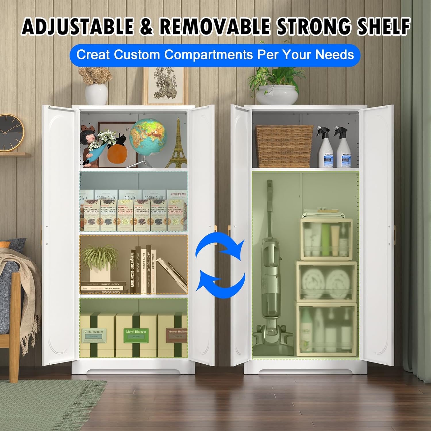 UNIQUE DESIGN & MULTI-PURPOSE: Crafted from premium 100% steel, this tall pantry cabinet is equipped with 2 reserved hole on its back so that secures it firmly to the wall conveniently, eliminating any tipping concerns while the magnetic door design ensures convenient opening and closing. Very suitable for various home and office spaces, such as kitchens, restaurants, bedrooms, study rooms, living rooms, entrances, laundry room, utility room or garage etc