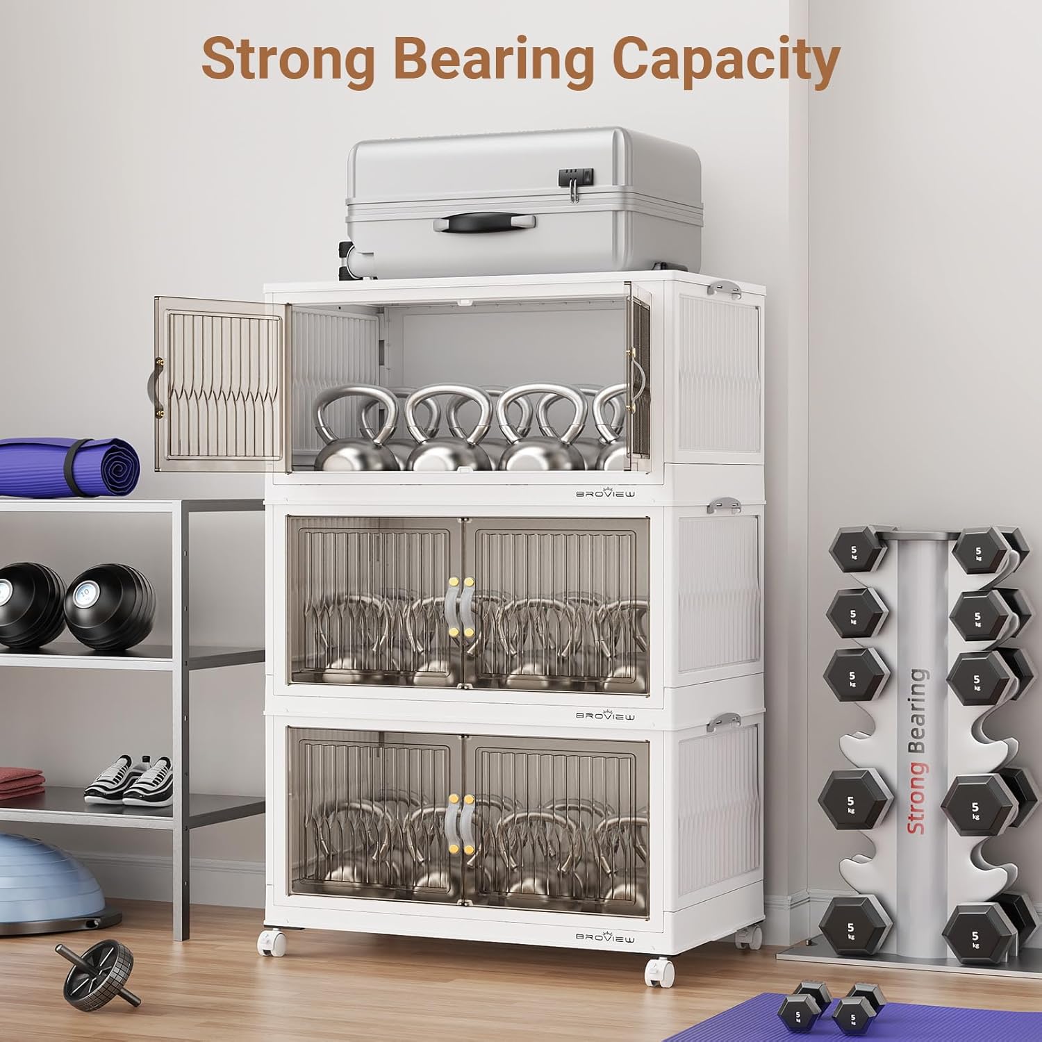 【Magnetic Front Open Doors & Wheeled】The large storage bins with doors provide two options: front doors opening or top lid opening. The brown door can be easily seen through and with a magnetic device. The 4x 360-degree rotating wheels all have fixed functions and can be easily moved by releasing the valve, making them friendly to the elderly.