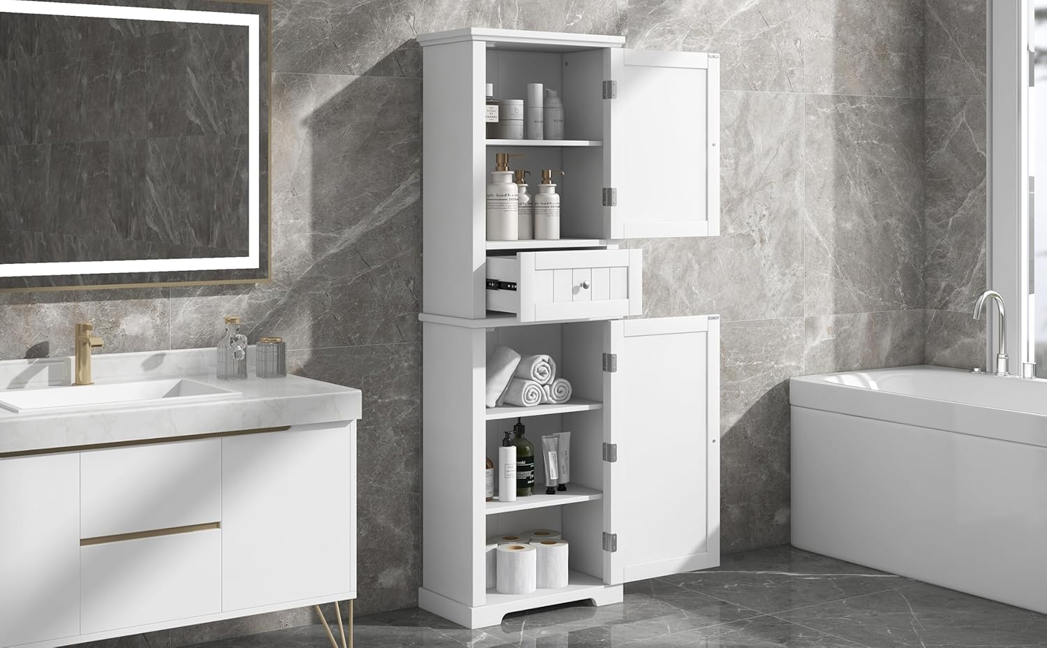 【Adjustable Shelves for Space-saving】:The 2 cabinets with doors contain a total of 5 compartments. The baffles between the compartments can be removed or adjusted in height, facilitating you to use more flexibly. Large space can store towels, shower gel, and other daily necessities according to your needs.