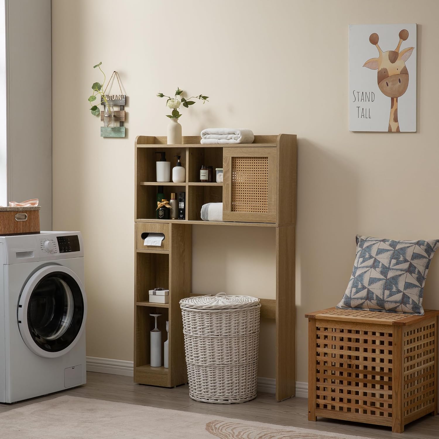 【6 Tier Expaned 200% Storage Space】-This bathroom rack over the toilet with the top open shelf is an easy solution for plants, shampoo. And in the middle space, this rattan weaves door design hides your secret private information. The lower cabinet room for your roll paper, bath towels, skincare, and Laundry detergent. The freestanding vertical orientation design saves precious floor space, so it’s a good option for a tiny bathroom, and helps expanding your bathroom to 200% and more.