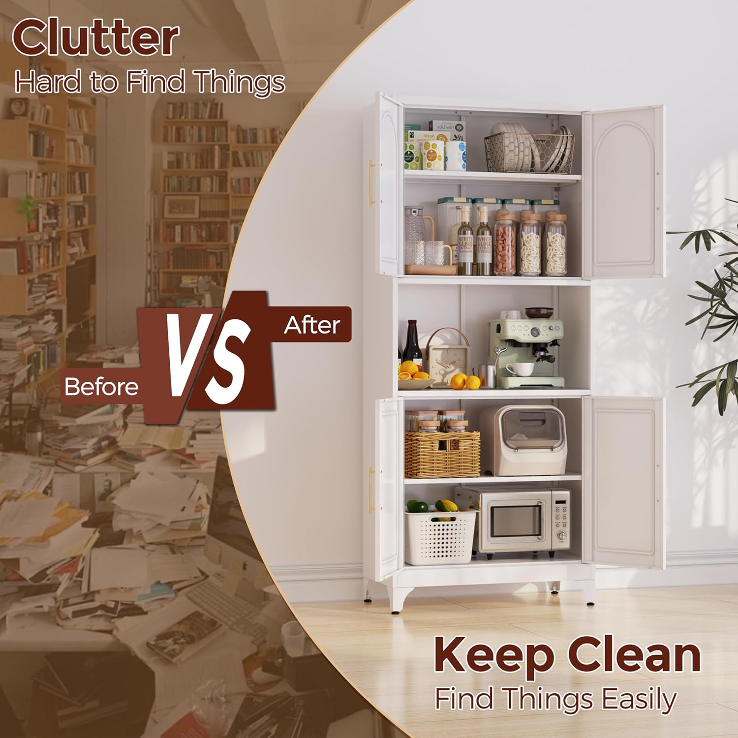 【Easy Assemble】Our pantry cabinets come with clear and complete parts and detailed installation instructions. One person can also assemble it quickly. Upgrade your kitchen storage with metal pantry cabinet