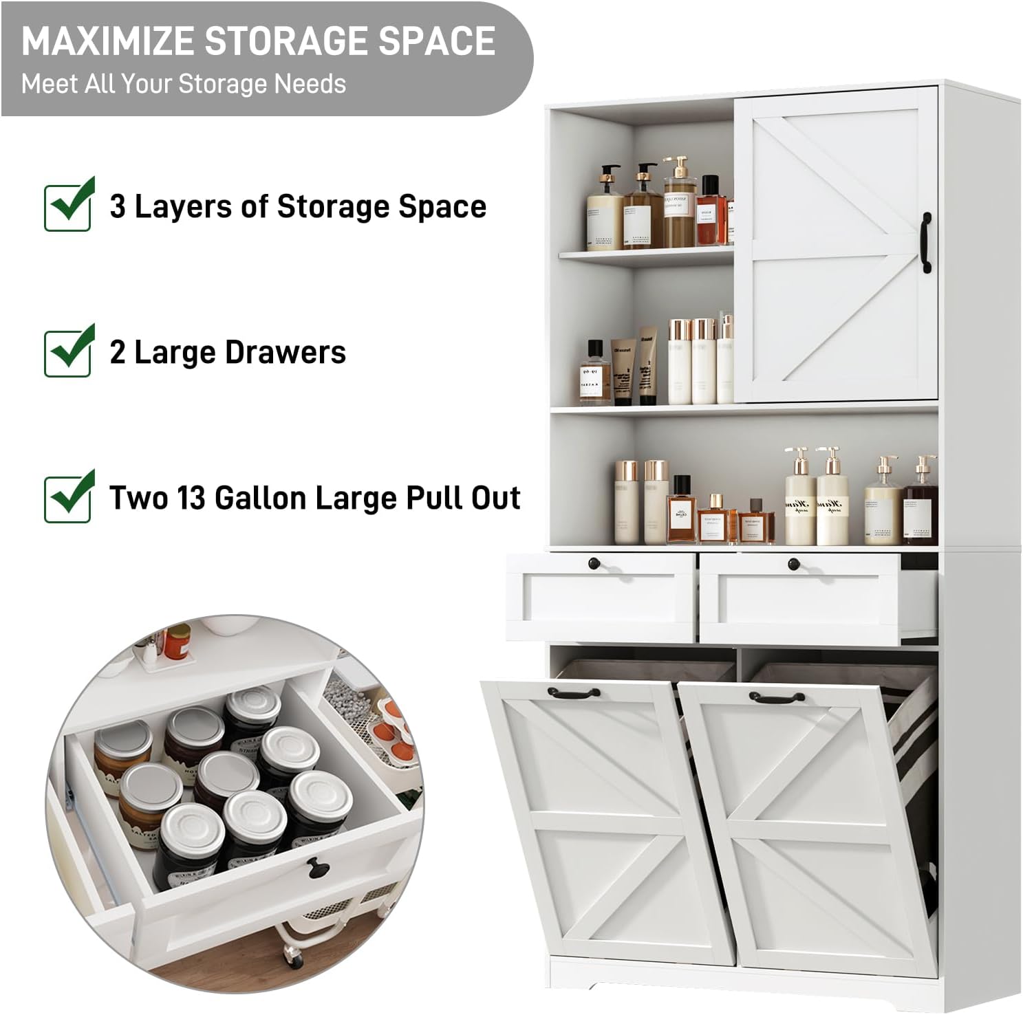 Outward-tilting door: The Double Tilt Out laundry cabinet is designed with two 13 gallon hidden laundry hamper (Laundry basket included), which not only effectively avoids the embarrassment of Dirty Laundry exposed, but also saves valuable storage space due to the hidden design. This design can help you keep the laundry room clean and effectively isolate the odor. It is suitable for people who pursue efficient and tidy laundry room