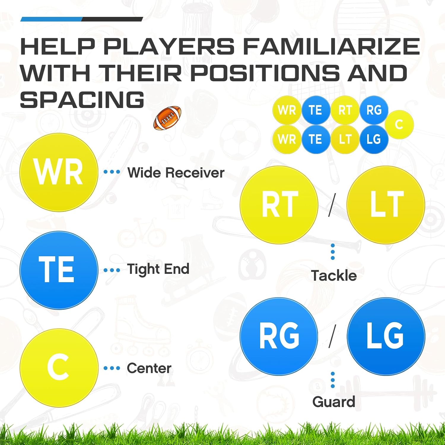 Distinctive Lettering for Position Simulations: the orange football yard markers come with white letters including 2 WR, 2 TE, 1 RG, 1 LG, 1 RT, 1 LT, 1 C; These markings make simulate game positioning superbly; Practicing with these mats will help players familiarize with their positions and spacing, simplifying their training