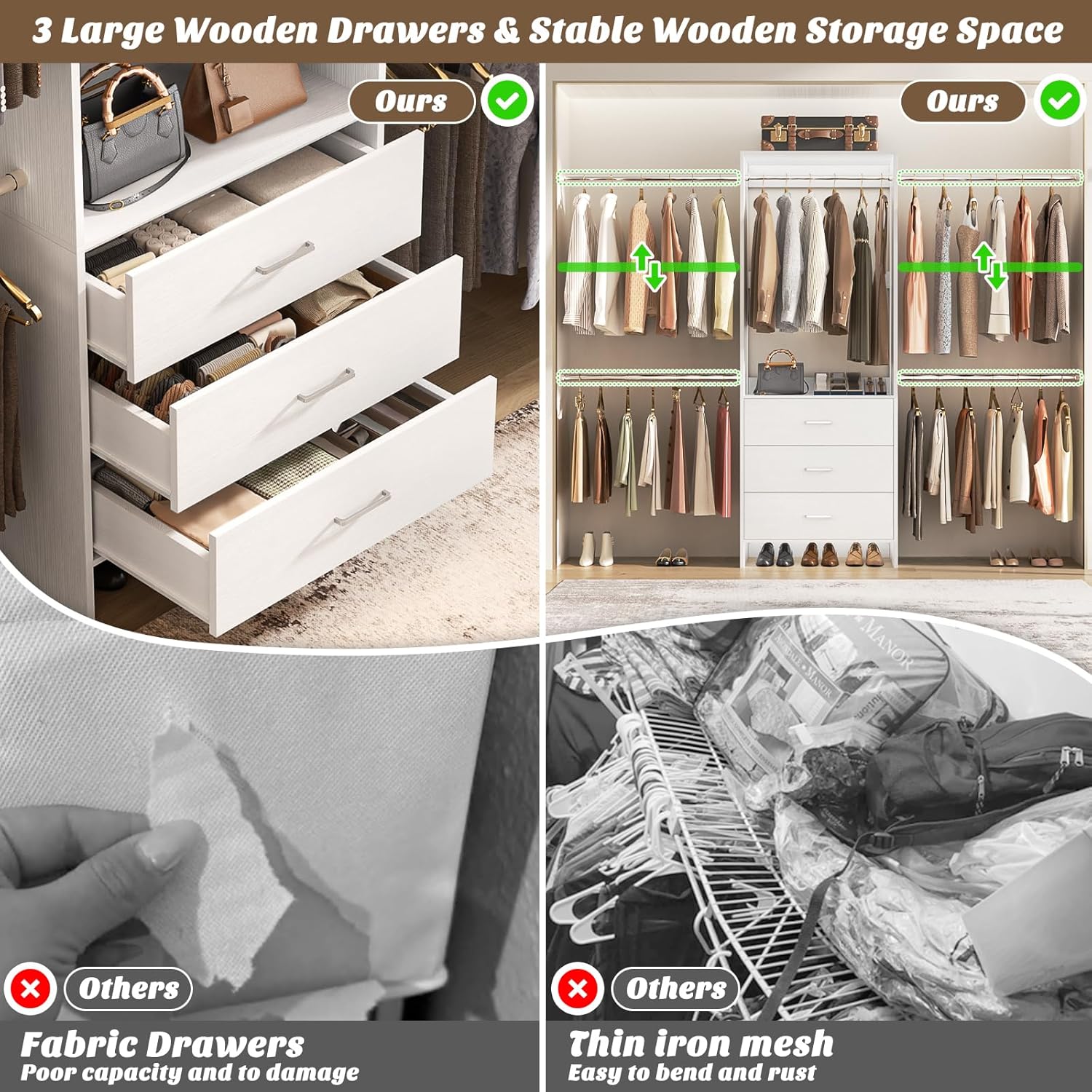 【High-Quality Wood Closet Organizer】This closet system is designed to withstand the test of time—no bending or breaking here. Say goodbye to flimsy metal racks and hello to durability with our premium wood closet organizer! With 1000+ lbs capacity and the ability to hold 400 pieces of clothing.And Our wardrobe is 6.7 feet tall, much higher than others, which ensures more space for hanging clothes and avoids stacking on the ground