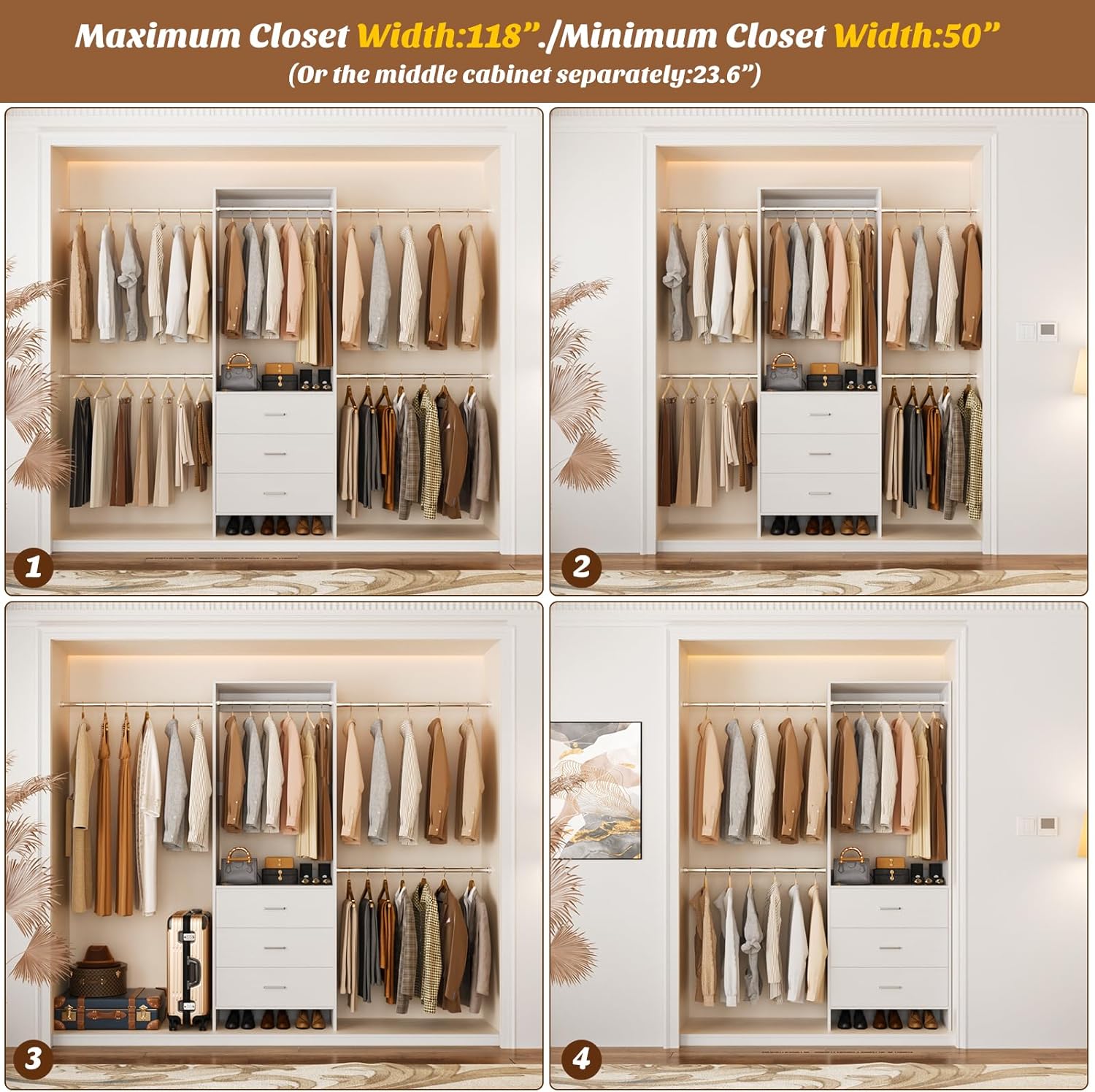 【Customize and DIY Your Dream Walk-in Closet】With 4 expandable hanging rods, you can easily create a personalized closet system tailored to your space. It fits 4.2-9.8FT wide closets area.The length of the telescopic rods on both sides is 26.4 to 47.2 inches.Customizing your closet has never been this easy or stylish. Alternatively, you can also use the middle closet separately.