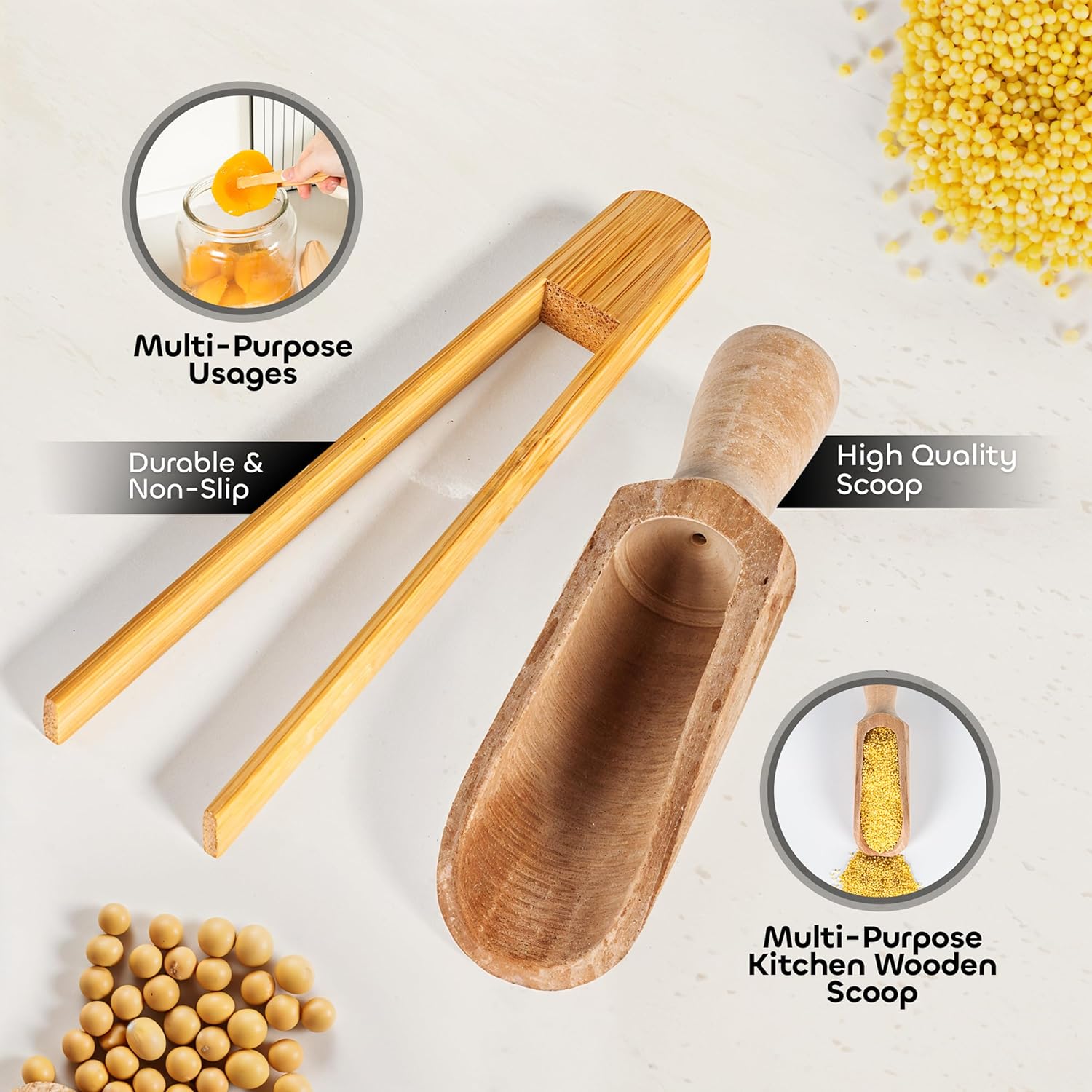 PRACTICAL & STYLISH ACCESSORIES INCLUDED: Each set comes with a wooden scoop and tongs, enhancing convenience and style when handling contents. Whether you’re using these jars as powder detergent containers or for storing dry ingredients, the accessories provide an elegant touch while ensuring precise portion control.