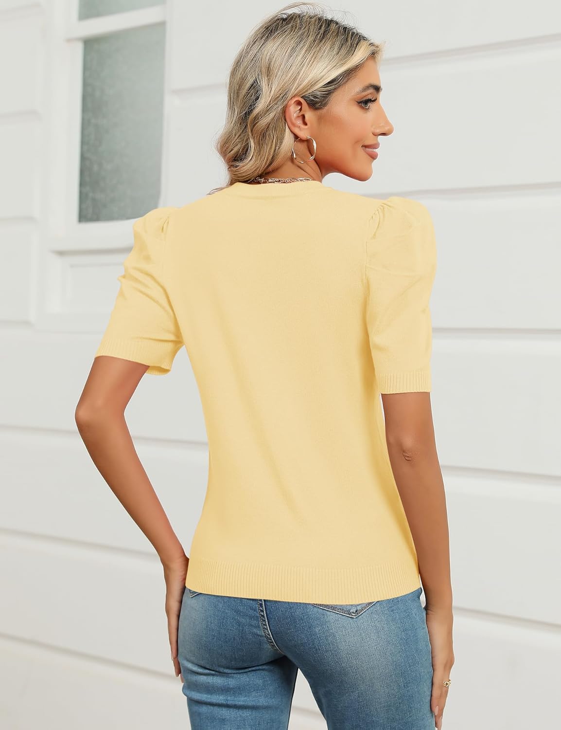 AKEWEI Puff Short Sleeve Sweater for Women Tops Trendy Spring Summer 2025 Business Casual Outfits Knit Crewneck Shirt Blouses
