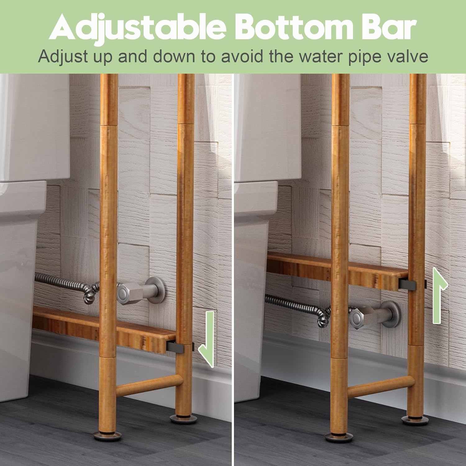 Suitable size: The bathroom toilet shelf is 55 x 25 x 10 inches. Bottom shelf of toilet rack is 37.5 inches from the ground and fits most toilets. Adjustable bottom bar avoids toilet water valve.