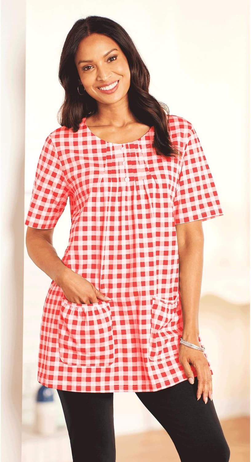 Introducing the AmeriMark Knit Tunic Top with Patch Pockets – Short Sleeve 100% Cotton Knit, Button Accents – Machine Washable. This versatile tunic is designed to offer both comfort and style, making it an essential addition to your wardrobe. Crafted from 100% cotton knit, it ensures breathability and softness, perfect for all-day wear. The short sleeves make it ideal for warmer seasons, while the relaxed fit provides ease of movement and comfort.