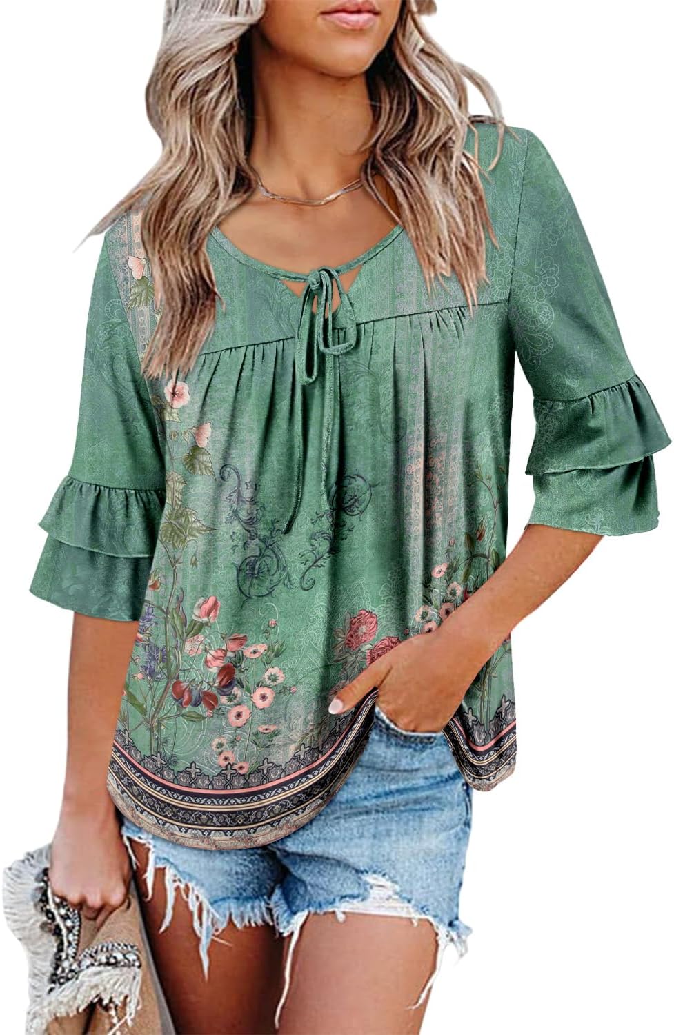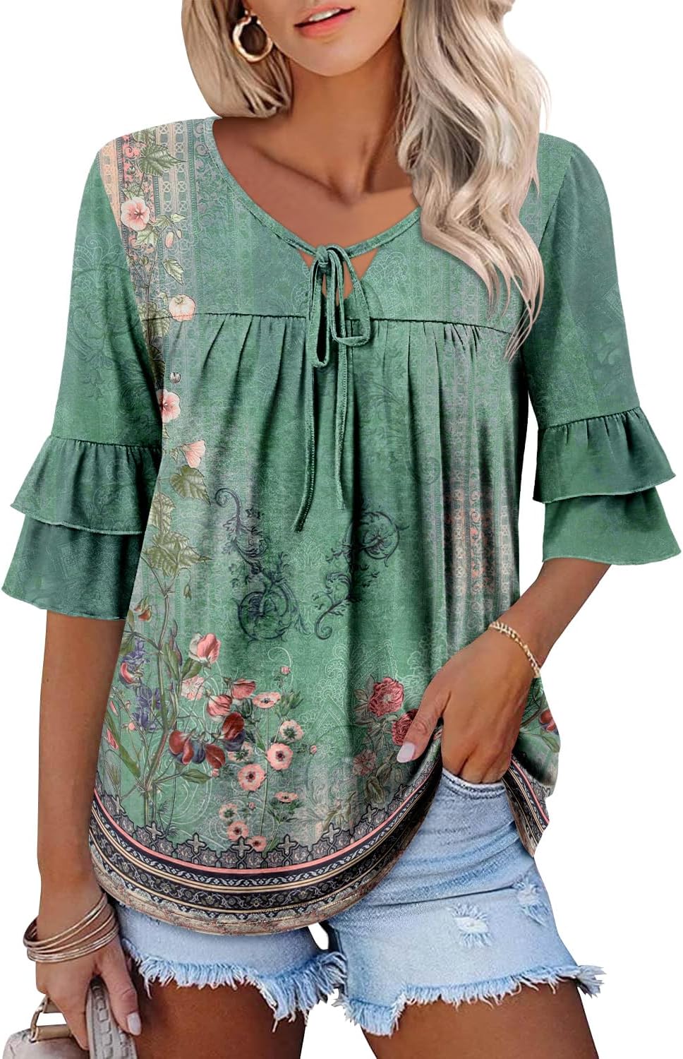 3/4 Length Sleeve Womens Tops Floral V Neck Tunic Tops Pleated Spring Shirts